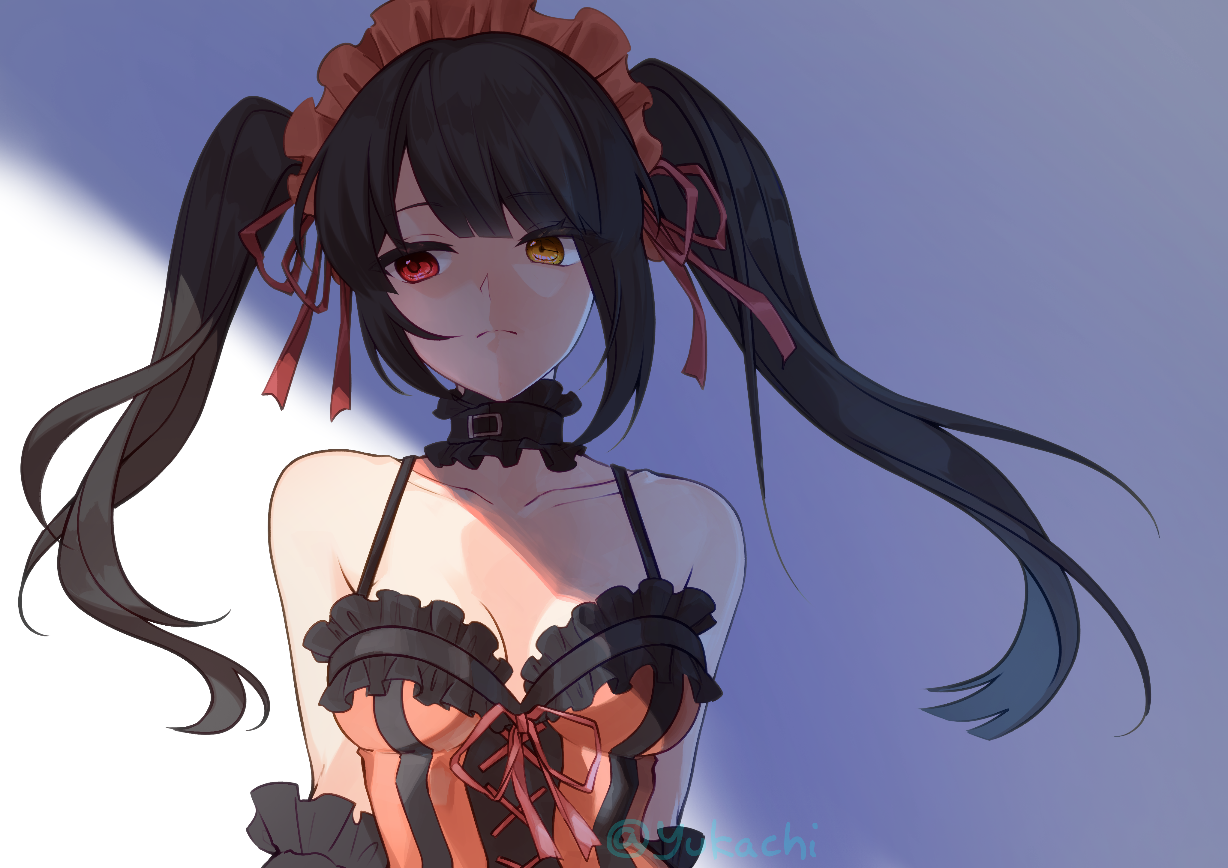 1girl absurdres bare_shoulders black_hair breasts cleavage clock clock_eyes date_a_live dress gothic_lolita hairband heterochromia highres lolita_fashion lolita_hairband long_hair medium_breasts red_eyes ribbon roman_numeral solo symbol-shaped_pupils tokisaki_kurumi twintails uneven_twintails yellow_eyes yukachiee