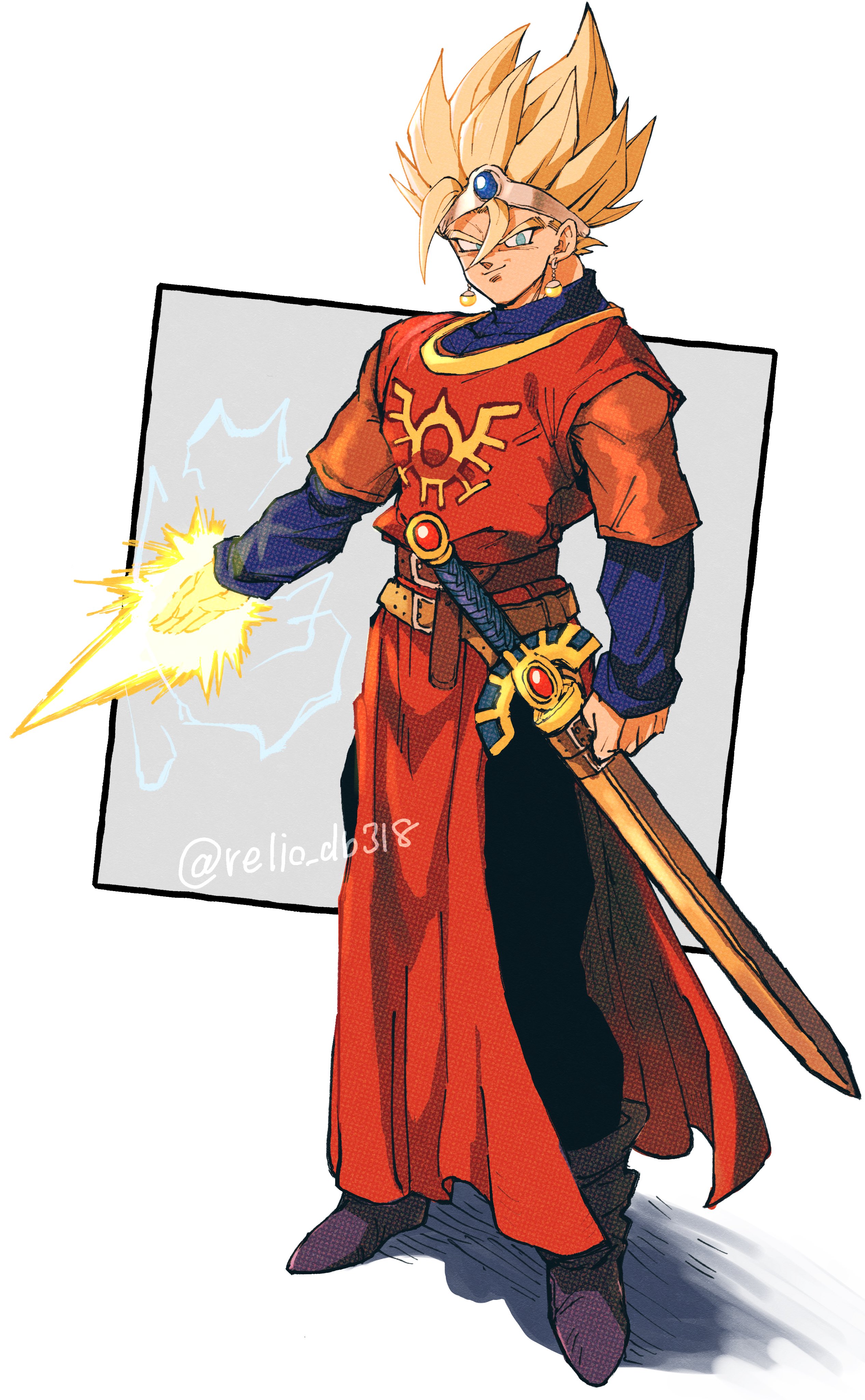 1boy absurdres aura black_pants blonde_hair blue_shirt cosplay dragon_ball dragon_quest dragonball_z earrings energy energy_sword green_eyes hero_(kenshin_dragon_quest) hero_(kenshin_dragon_quest)_(cosplay) highres jewelry kenshin_dragon_quest orange_shirt pants potara_earrings red_robe relio_db318 robe scabbard sheath shirt solo spiked_hair sword twitter_username vegetto weapon