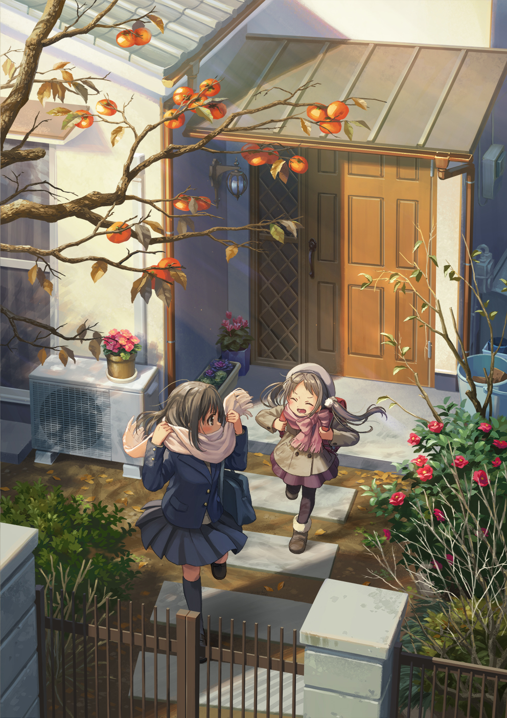2girls autumn_leaves backpack bag bare_tree beret black_footwear black_pantyhose black_thighhighs blue_jacket blue_skirt blush bow brick brown_footwear brown_hair brown_jacket brown_sweater bucket buttons camellia child closed_eyes commentary condenser_unit curtains drainpipe family_bonding flower flower_pot food fruit fur-trimmed_footwear fur_trim gate hair_ornament hands_up hat highres hirose_yuki house jacket leaf leg_up loafers looking_at_another multiple_girls open_mouth original outdoors pantyhose parted_bangs persimmon pink_flower pink_scarf pleated_skirt pom_pom_(clothes) pom_pom_hair_ornament purple_skirt randoseru red_bag scarf scarf_bow school_bag school_uniform shoes siblings sidelocks sisters skirt slice_of_life smile stepping_stones sweater teeth thighhighs tile_roof tree twintails walking wall_lamp white_hat windowsill
