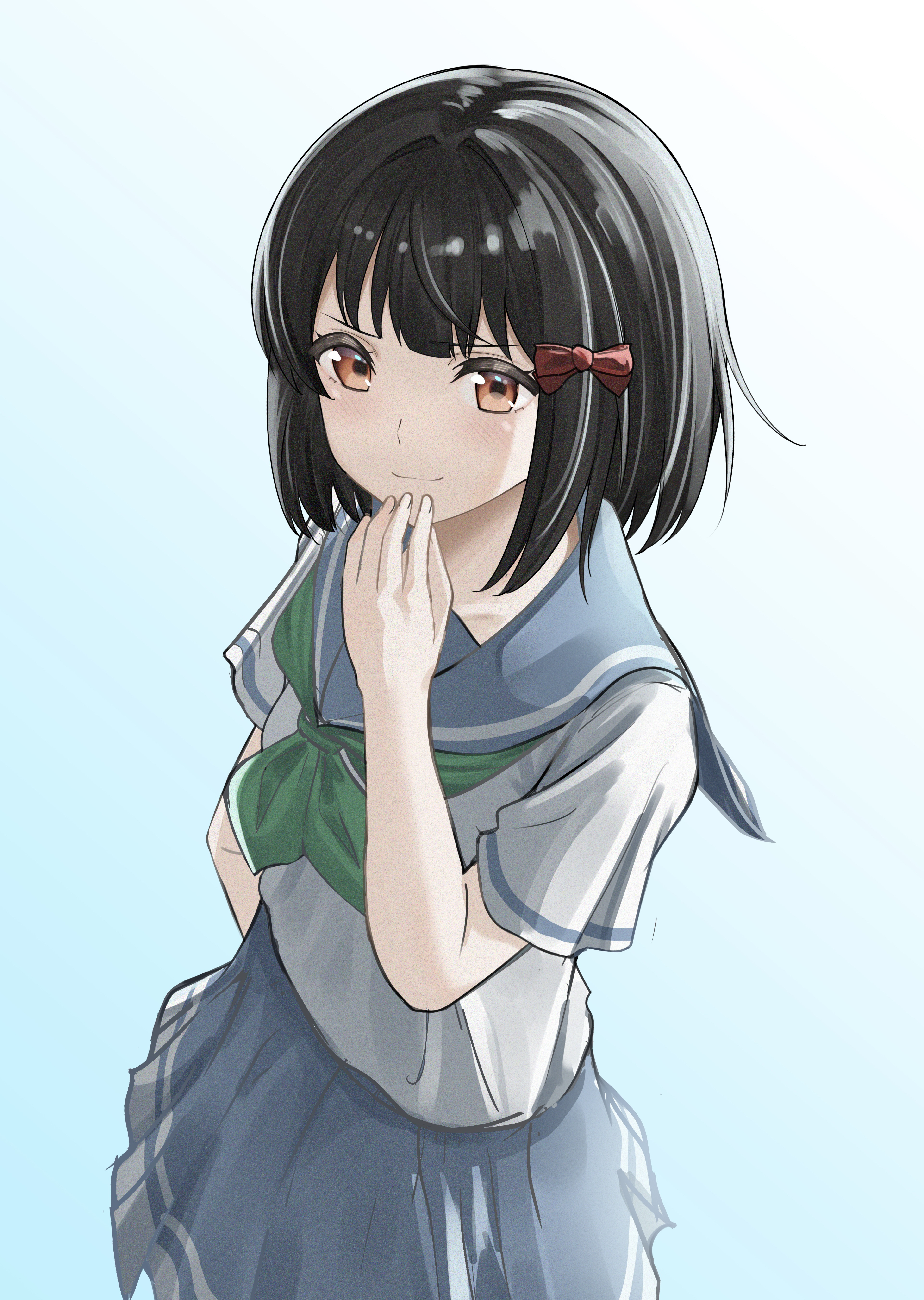 1girl absurdres akane_(tgixb) black_hair bow hair_bow hand_on_own_chin hibike!_euphonium highres hisaishi_kanade looking_at_viewer red_eyes school_uniform short_hair smile