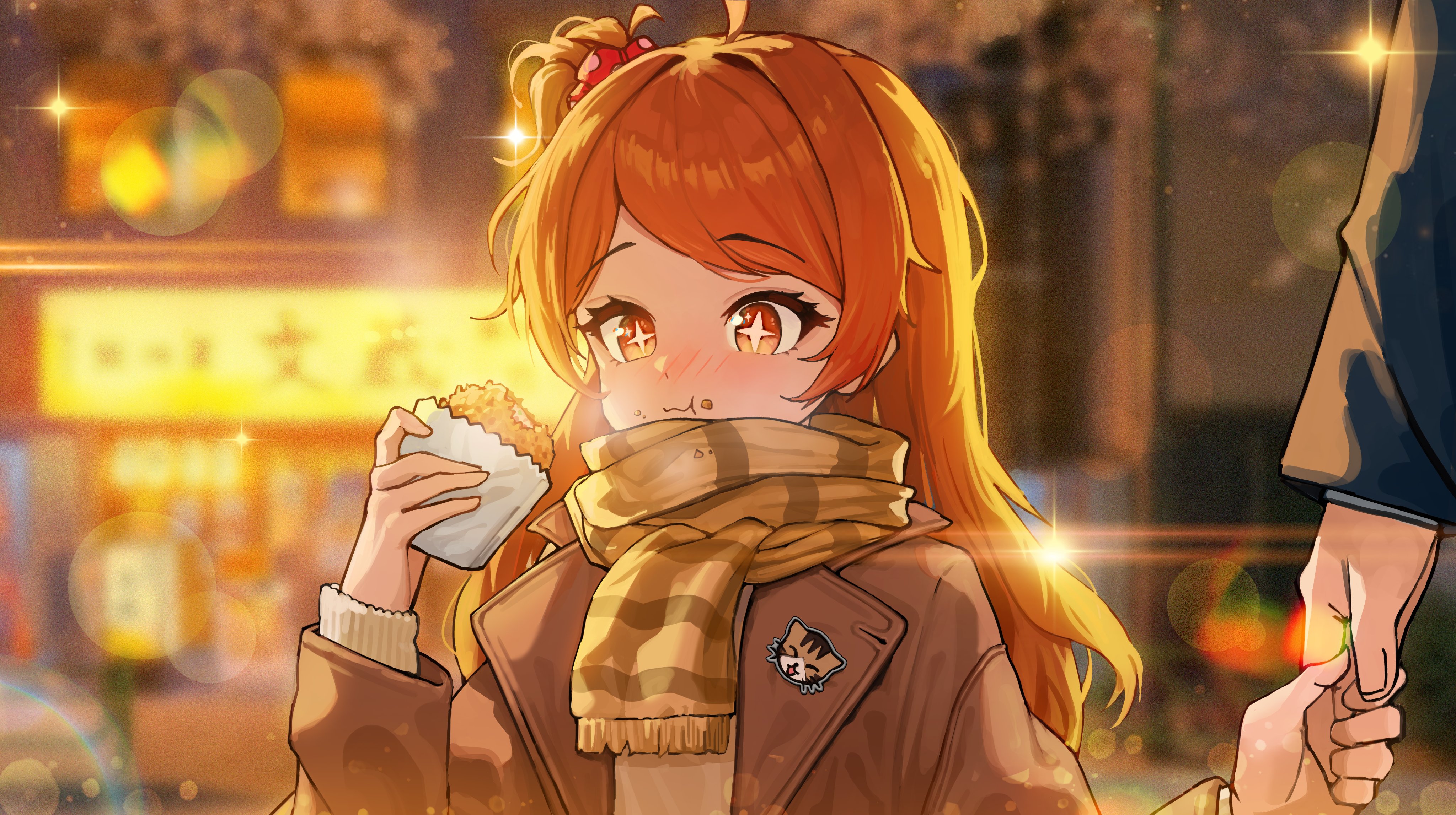 +_+ 1boy 1girl absurdres coat eating food food_on_face highres holding_hands idolmaster idolmaster_million_live! idolmaster_million_live!_theater_days long_hair night ogami_tamaki one_side_up orange_eyes orange_hair outdoors scarf sillon solo_focus winter_clothes