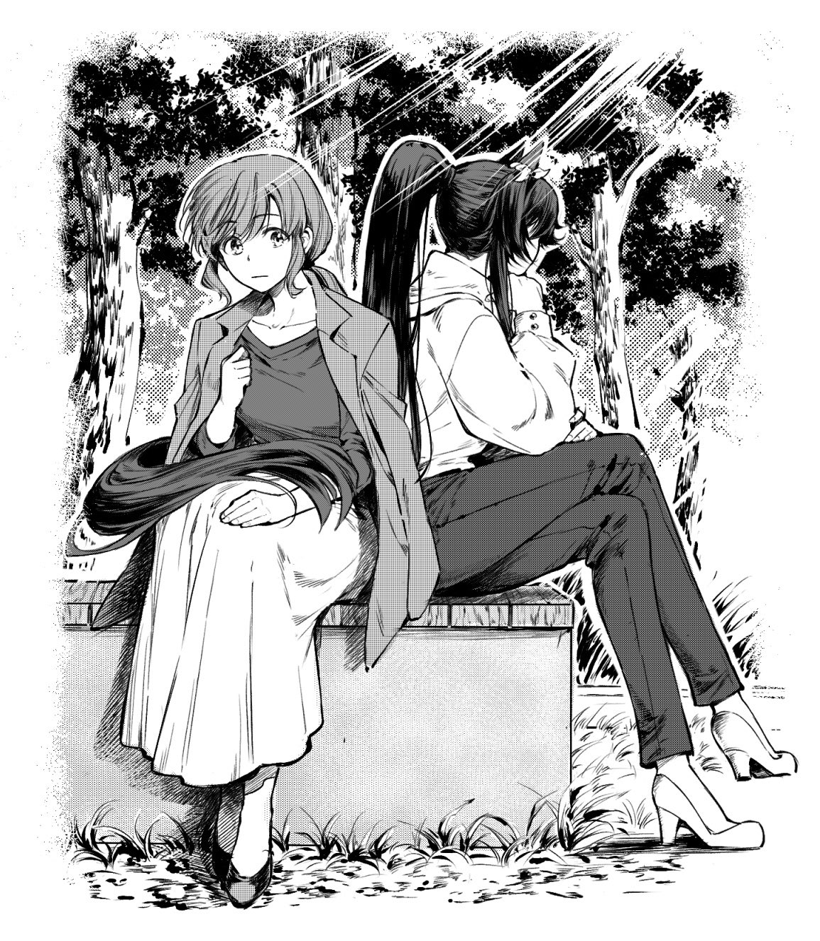 2girls animal_ears aoi_(aoi306) bench breasts casual closed_mouth coat crossed_legs ear_ornament female_trainer_(umamusume) full_body greyscale head_rest high_heels high_ponytail highres horse_ears horse_girl horse_tail jacket jacket_on_shoulders long_hair long_sleeves low_ponytail monochrome multiple_girls narita_brian_(umamusume) outdoors pants ponytail sidelocks sitting skirt small_breasts sunlight tail trainer_(umamusume) tree umamusume