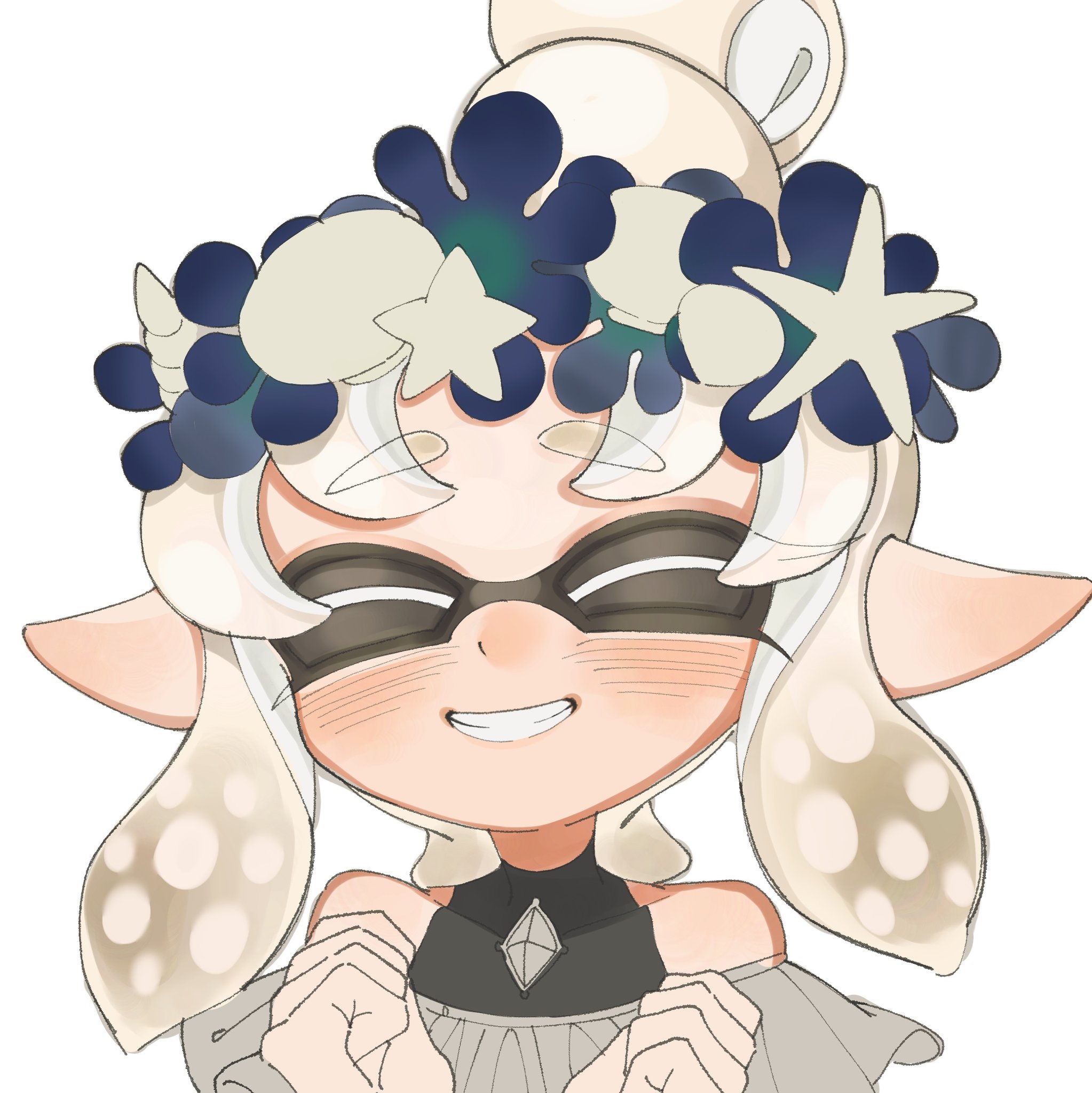 1girl ^_^ blush clenched_hand close-up closed_eyes covered_collarbone deformed head_wreath high_ponytail highres inkling inkling_girl inkling_player_character lemo_(lemo_4) medium_hair nintendo pointy_ears ponytail portrait short_ponytail smile solo splatoon_(series) splatoon_3 teeth tentacle_hair upper_body white_hair
