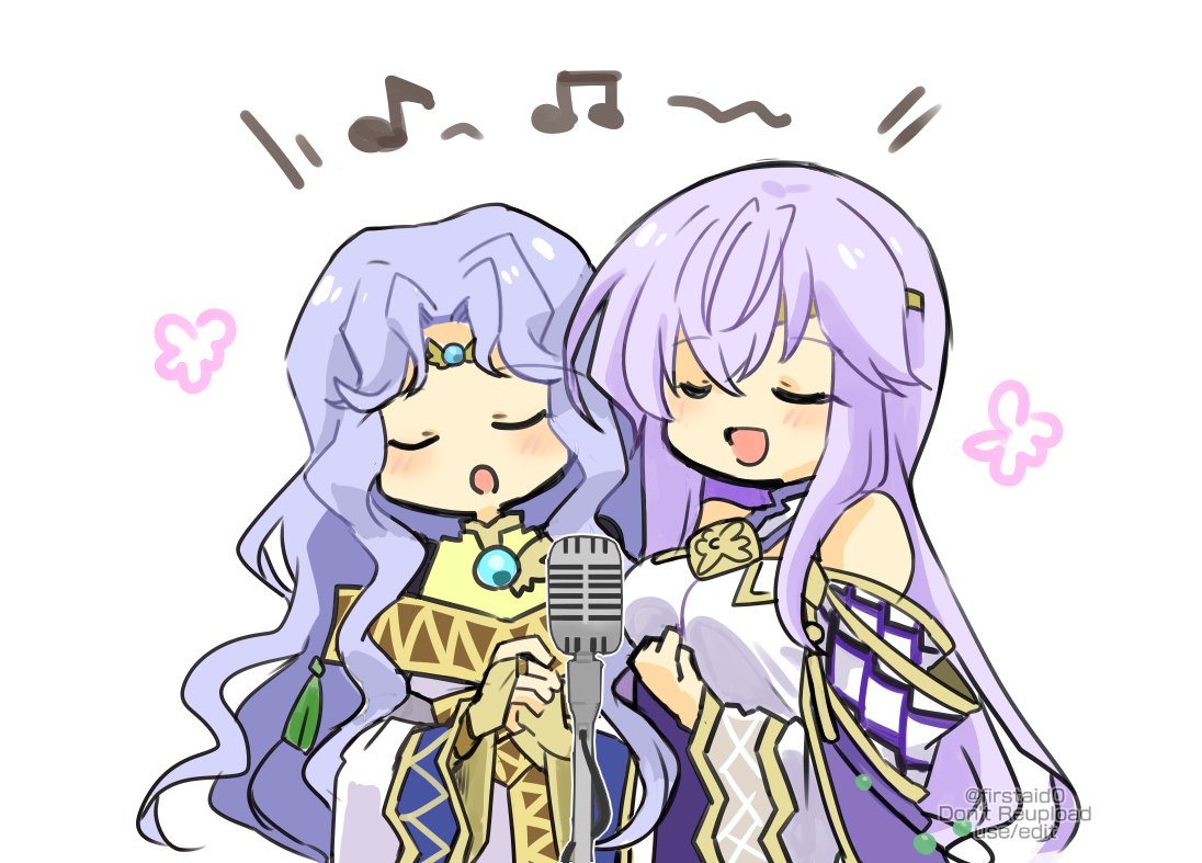 2girls cape circlet fire_emblem fire_emblem:_genealogy_of_the_holy_war fire_emblem:_thracia_776 julia_(fire_emblem) microphone multiple_girls music musical_note nintendo open_mouth purple_cape purple_hair sara_(fire_emblem) singing spoken_musical_note yukia_(firstaid0)