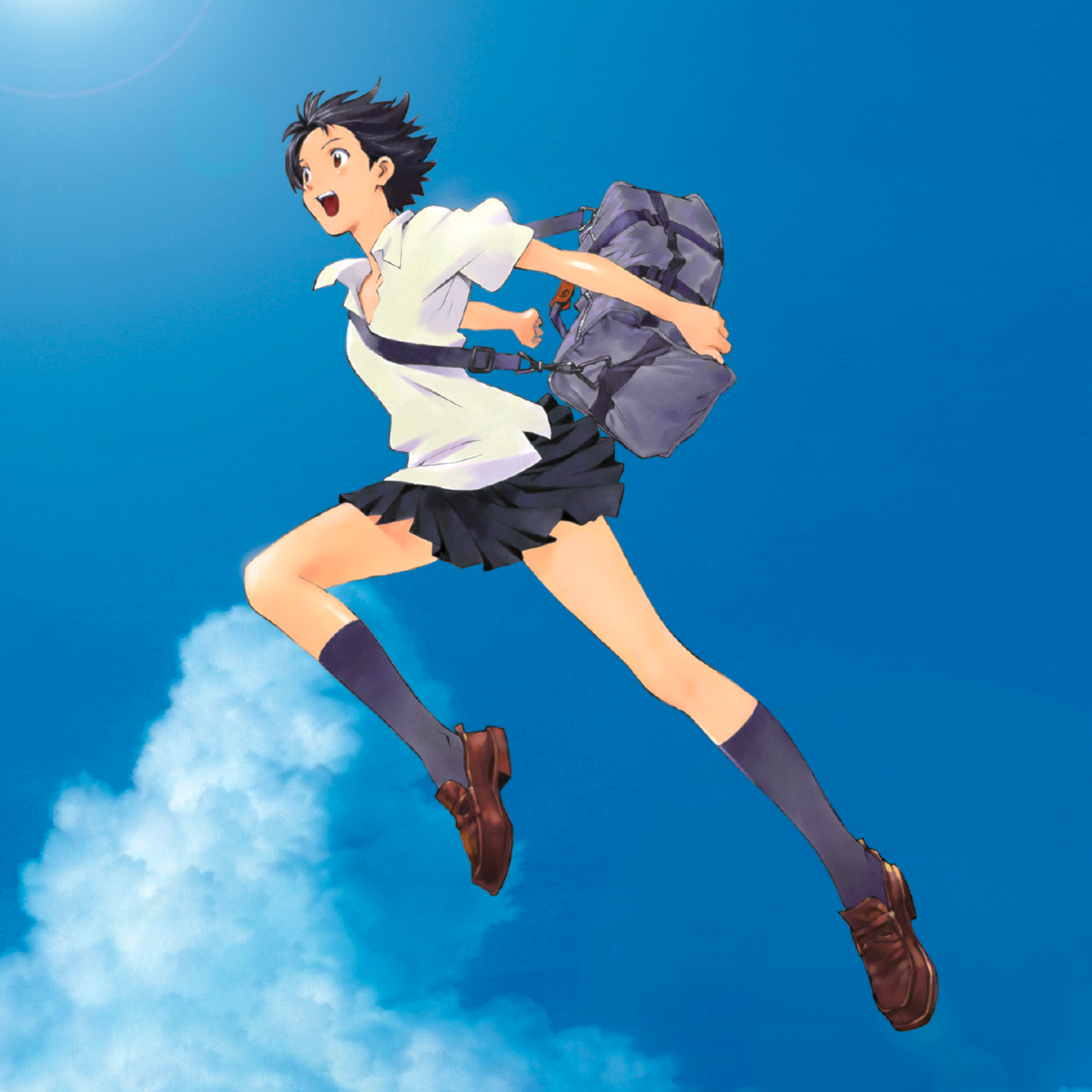 1girl :d bag black_hair black_skirt black_socks blue_bag blue_sky blurry blush bokeh breasts brown_eyes brown_shoes cloud collared_shirt cumulonimbus_cloud day depth_of_field duffel_bag foot_up full_body highres holding holding_bag jumping key_visual kneehighs konno_makoto loafers looking_ahead non-web_source official_art open_mouth outdoors pleated_skirt polo_shirt promotional_art sadamoto_yoshiyuki school_bag school_uniform shirt shoes short_hair short_sleeves skirt sky small_breasts smile socks solo strap teeth textless_version toki_wo_kakeru_shoujo upper_teeth_only very_short_hair white_shirt