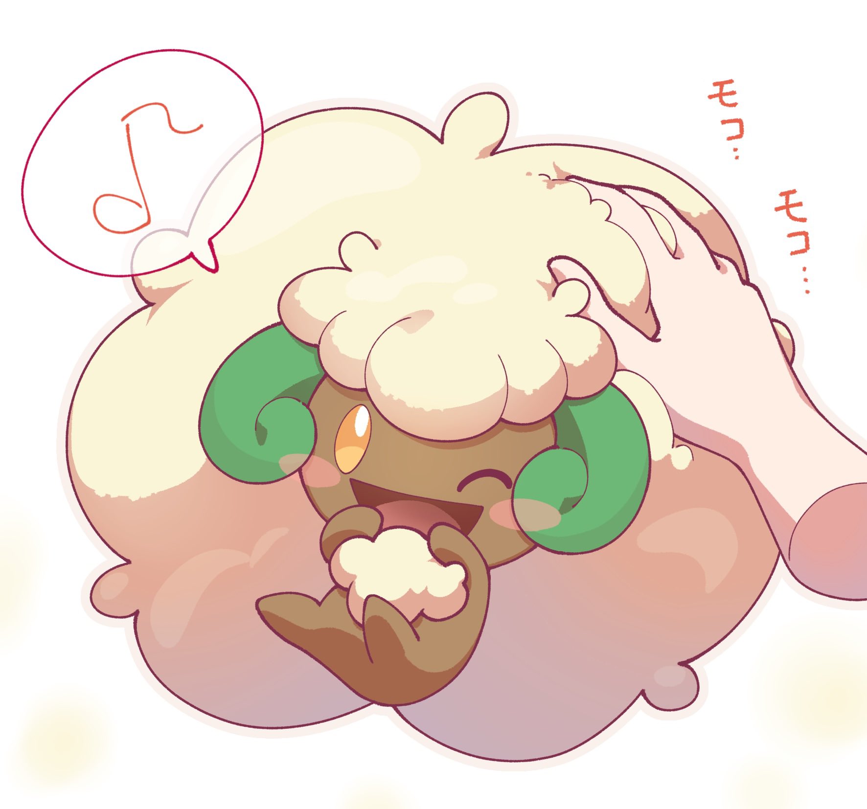 ;d animal_focus blush_stickers curled_horns disembodied_hand gen_5_pokemon green_horns grey_outline highres horns musical_note nintendo omochi_(omotimotittona3) one_eye_closed open_mouth orange_eyes outline petting pokemon pokemon_(creature) smile speech_bubble spoken_musical_note whimsicott wool