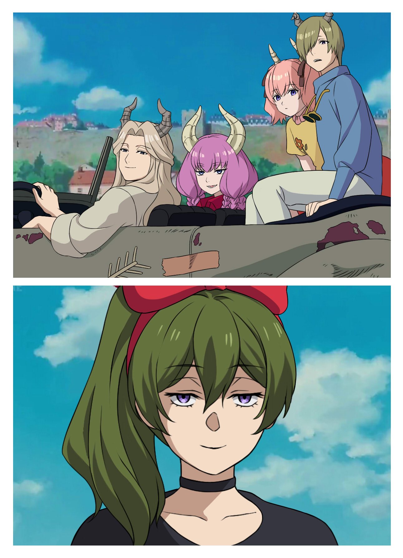 2boys 3girls aura_(sousou_no_frieren) black_choker black_dress blue_sky bow building car choker closed_mouth cloud collarbone commentary cosplay cumulonimbus_cloud day demon_boy demon_girl demon_horns draht_(sousou_no_frieren) dress driving green_hair hair_between_eyes hair_bow hair_ribbon hairband highres horns jitome kiki_(majo_no_takkyuubin) kiki_(majo_no_takkyuubin)_(cosplay) light_smile linie_(sousou_no_frieren) long_hair looking_at_viewer lugner_(sousou_no_frieren) majo_no_takkyuubin motor_vehicle multiple_boys multiple_girls outdoors red_bow red_hairband red_ribbon ribbon sanpaku scene_reference side_ponytail sitting sky sousou_no_frieren syaparinton town ubel_(sousou_no_frieren)