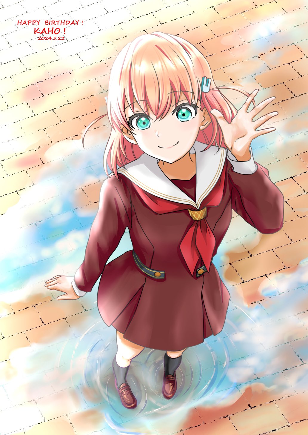 1girl ankle_socks aqua_eyes arm_at_side black_socks brick_road brown_dress brown_shoes character_name closed_mouth commentary_request crossed_bangs dated dress from_above full_body hair_ornament happy_birthday hasu_no_sora_school_uniform highres hinoshita_kaho link!_like!_love_live! loafers long_sleeves looking_at_viewer love_live! medium_hair neckerchief orange_hair pleated_dress puddle rabbit_hair_ornament red_neckerchief ripples sailor_collar sailor_dress school_uniform shoes short_dress smile socks solo split_mouth two_side_up urusiyamaxdane1 virtual_youtuber waving white_sailor_collar winter_uniform