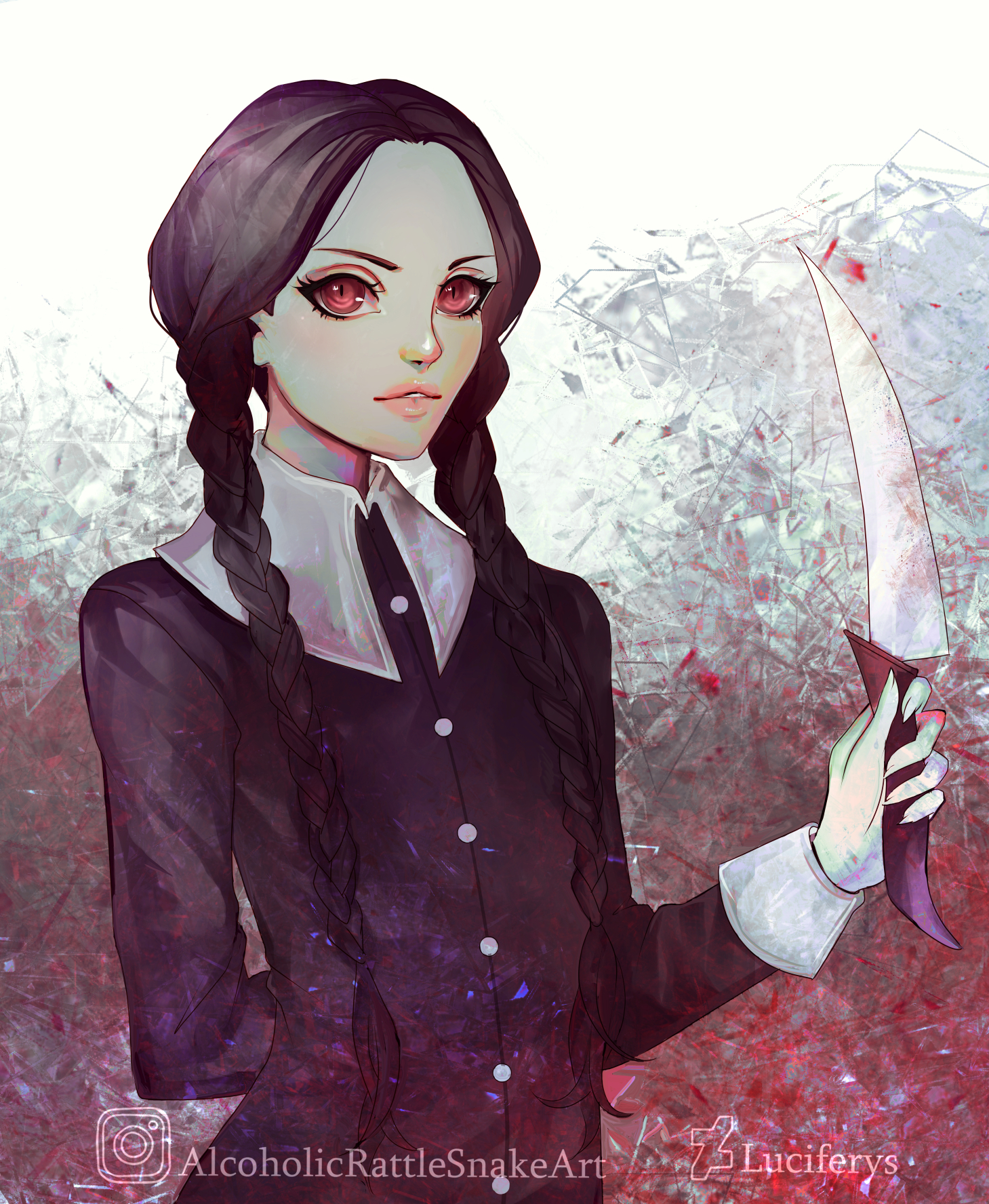 1girl the_addams_family alcoholicrattlesnake arm_behind_back black_dress black_hair braid buttons collared_dress deviantart_username dress eyelashes fingernails highres holding holding_knife instagram_username knife long_hair long_sleeves looking_at_viewer parted_lips red_eyes sharp_fingernails solo twin_braids upper_body wednesday_(netflix) wednesday_addams