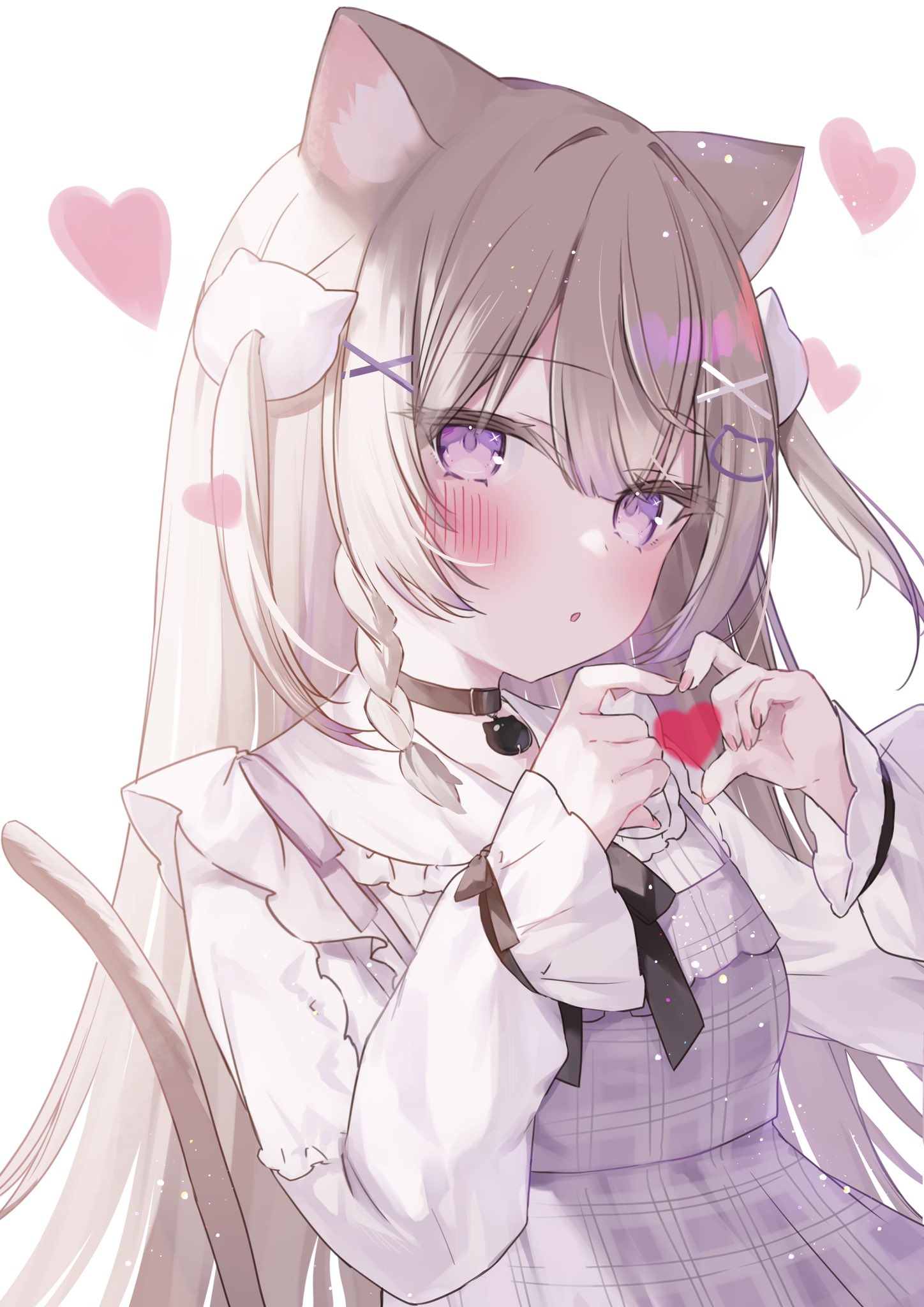 1girl :o animal_ears black_bow blush bow braid brown_hair cat_ears cat_girl cat_hair_ornament cat_tail collar collared_shirt commentary_request frilled_shirt_collar frilled_sleeves frills hair_ornament hairclip hakua_aa heart heart_hands highres indie_virtual_youtuber long_hair long_sleeves minaneko_mai nail_polish parted_lips pink_nails plaid_clothes plaid_vest purple_eyes purple_vest shirt simple_background single_braid solo tail two_side_up upper_body vest virtual_youtuber white_background white_shirt x_hair_ornament