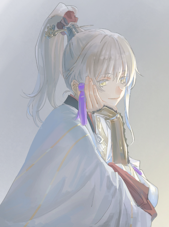 1boy androgynous archer_(fate/samurai_remnant) arm_guards chinese_clothes chinese_hairpin fate/samurai_remnant fate_(series) grey_hair hair_ornament hanfu high_ponytail keclpshvli long_hair male_focus multicolored_hair ponytail simple_background smile solo streaked_hair tassel tassel_hair_ornament yellow_eyes