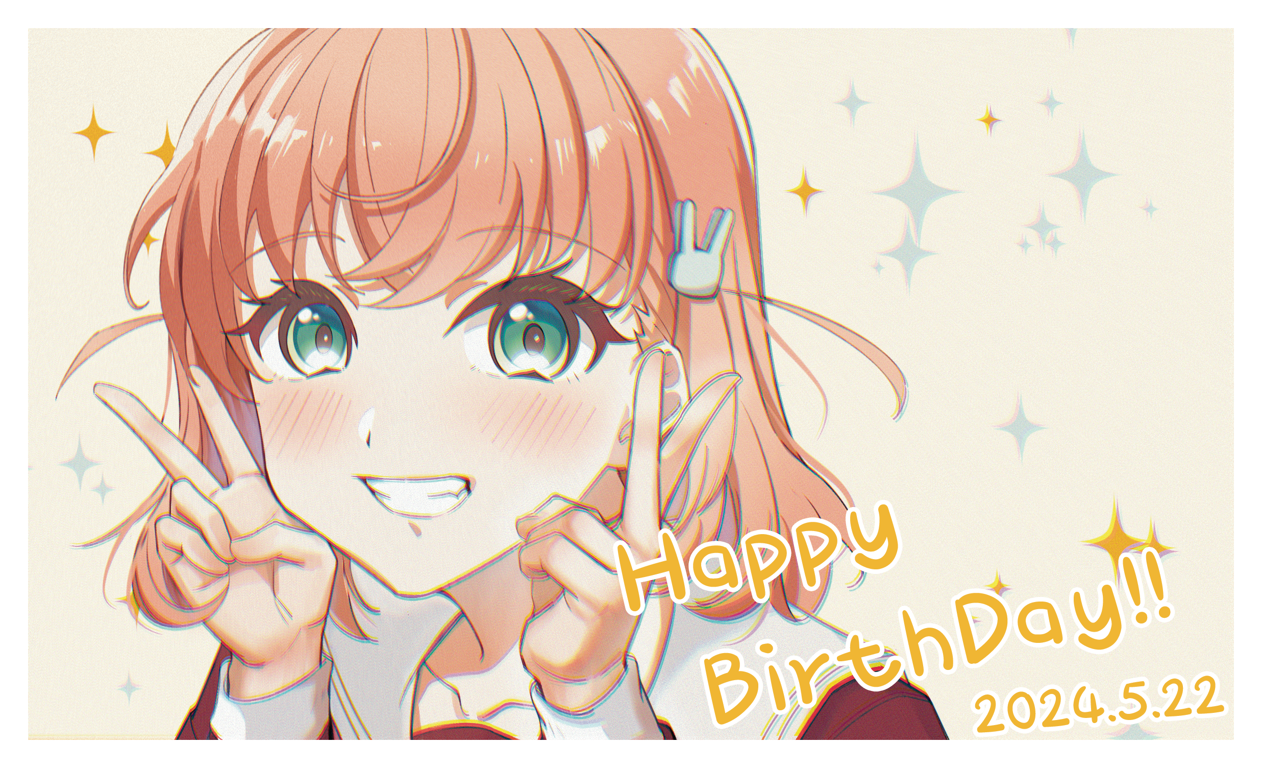1girl blush border chromatic_aberration collarbone commentary crossed_bangs dated double_v fang grin hair_ornament happy_birthday hasu_no_sora_school_uniform highres hinoshita_kaho link!_like!_love_live! long_sleeves looking_at_viewer love_live! medium_hair orange_hair rabbit_hair_ornament sailor_collar sbh250 school_uniform smile solo sparkle two_side_up v virtual_youtuber white_border white_sailor_collar winter_uniform yellow_background