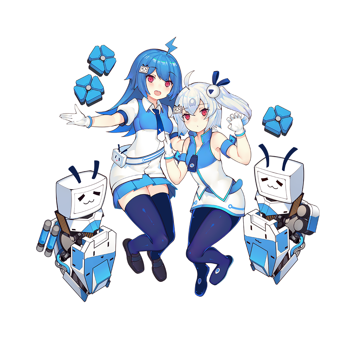 2girls ahoge antennae aqua_hair aqua_skirt artist_request bare_shoulders belt bili_girl_22 bili_girl_33 bilibili blue_belt blue_hair blue_necktie blue_pantyhose blue_skirt blue_thighhighs blue_wrist_cuffs blush brown_footwear buttoned_cuffs buttons cable claw_pose closed_mouth collared_shirt fang final_gear gloves hair_between_eyes hair_ornament half_updo highres jacket lightning_bolt_symbol loafers long_hair looking_at_viewer multicolored_jacket multiple_girls necktie official_art one_side_up open_mouth outstretched_arm outstretched_hand pantyhose pleated_skirt puffy_sleeves red_eyes robot sash shirt shoes short_hair short_sleeves side_ponytail simple_background skin_fang skirt sleeveless striped_clothes striped_skirt television thighhighs third-party_source transparent_background triangle_print tube tv_hair_ornament two-tone_gloves two-tone_jacket two-tone_necktie two-tone_skirt white_gloves white_hair white_sash white_shirt white_skirt wrist_cuffs zipper_pull_tab