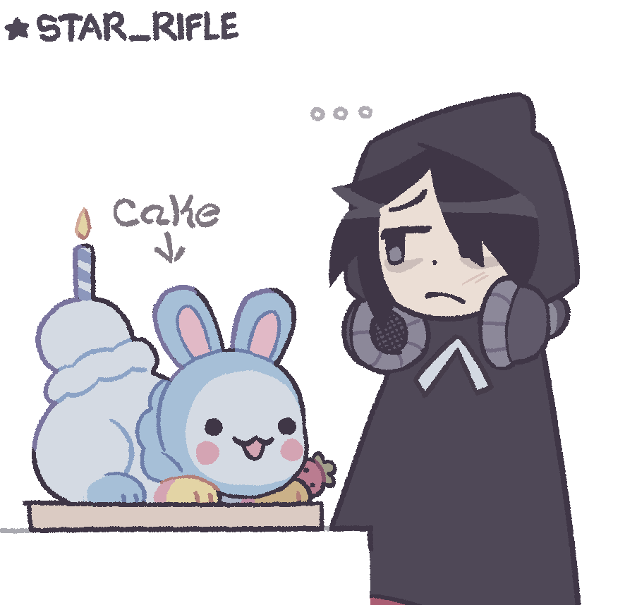 1boy :3 bags_under_eyes black_hair cake food headphones pale_skin rabbit_ears star_rifle