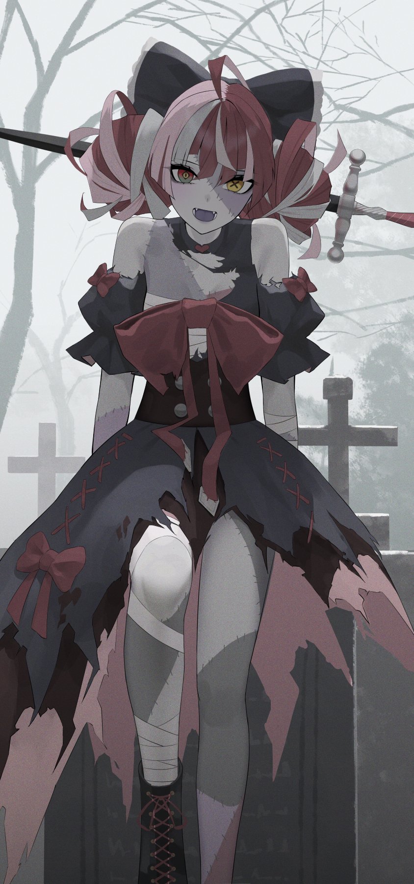 1girl bandaged_arm bandaged_leg bandages bow colored_skin double_bun dress graveyard grey_hair grey_skin grey_theme hair_bow hair_bun heterochromia highres hololive hololive_indonesia kureiji_ollie kureiji_ollie_(1st_costume) ootsuka_you patchwork_skin red_bow red_hair sword symbol-shaped_pupils tombstone torn_clothes virtual_youtuber weapon zombie