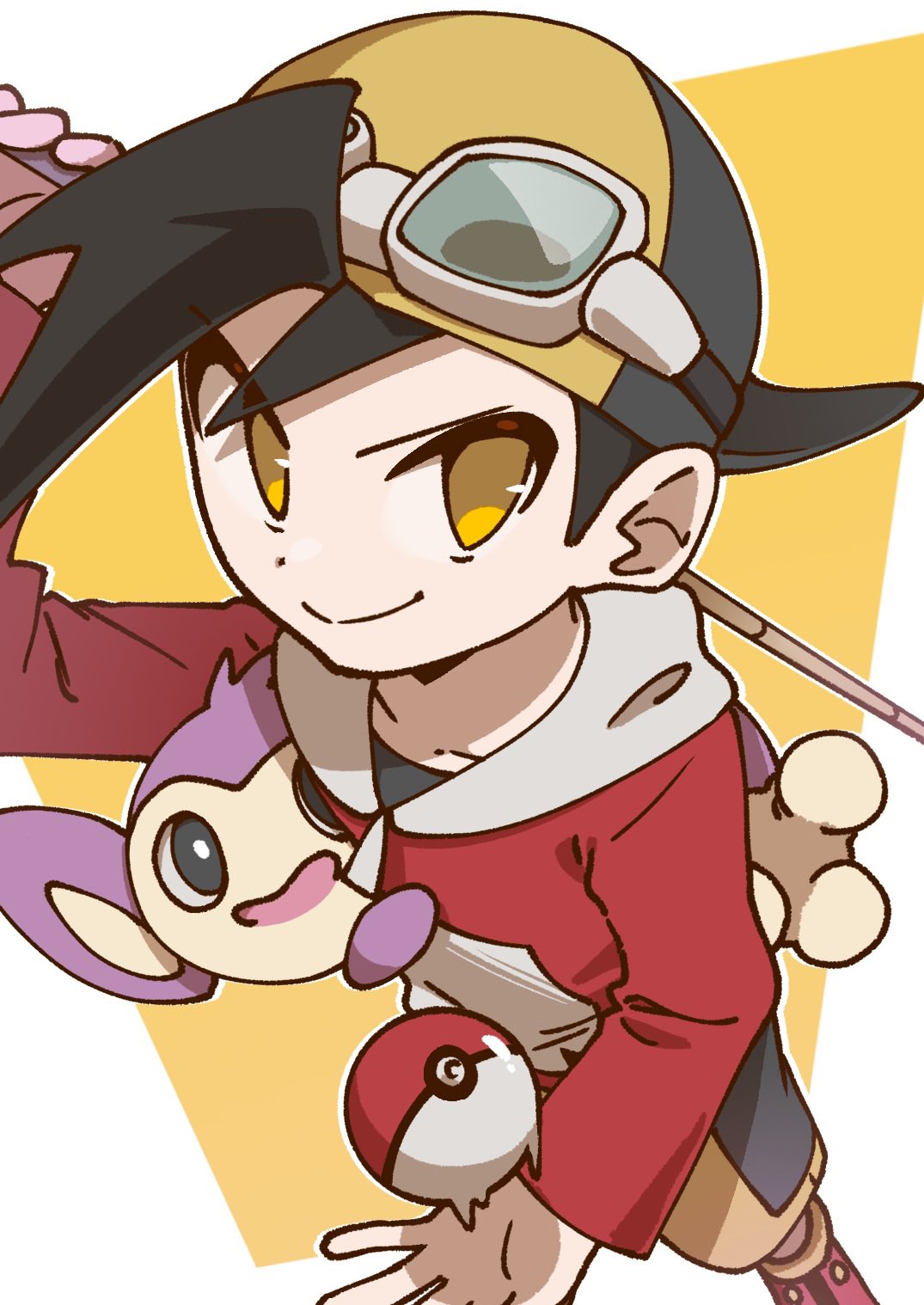 1boy aipom backwards_hat black_hair closed_mouth collarbone ethan_(pokemon) from_above gen_2_pokemon goggles goggles_on_headwear hat highres long_sleeves nintendo omochi_(omotimotittona3) pokemon pokemon_(creature) pokemon_adventures short_hair smile standing yellow_eyes