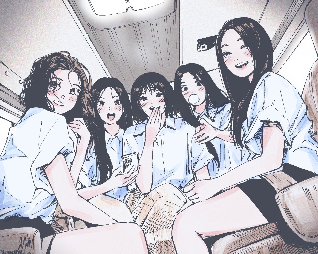 5girls animification black_hair black_skirt blush brown_hair bubble_gum_(newjeans) cellphone chewing_gum collared_shirt covering_own_mouth danielle_(newjeans) derivative_work haerin_(newjeans) hanni_(newjeans) holding holding_phone hyein_(newjeans) k-pop looking_at_viewer minji_(newjeans) multiple_girls newjeans one_eye_closed open_mouth parted_lips phone polo_tokki real_life screenshot_redraw shirt shirt_tucked_in skirt smartphone smile vehicle_interior white_shirt