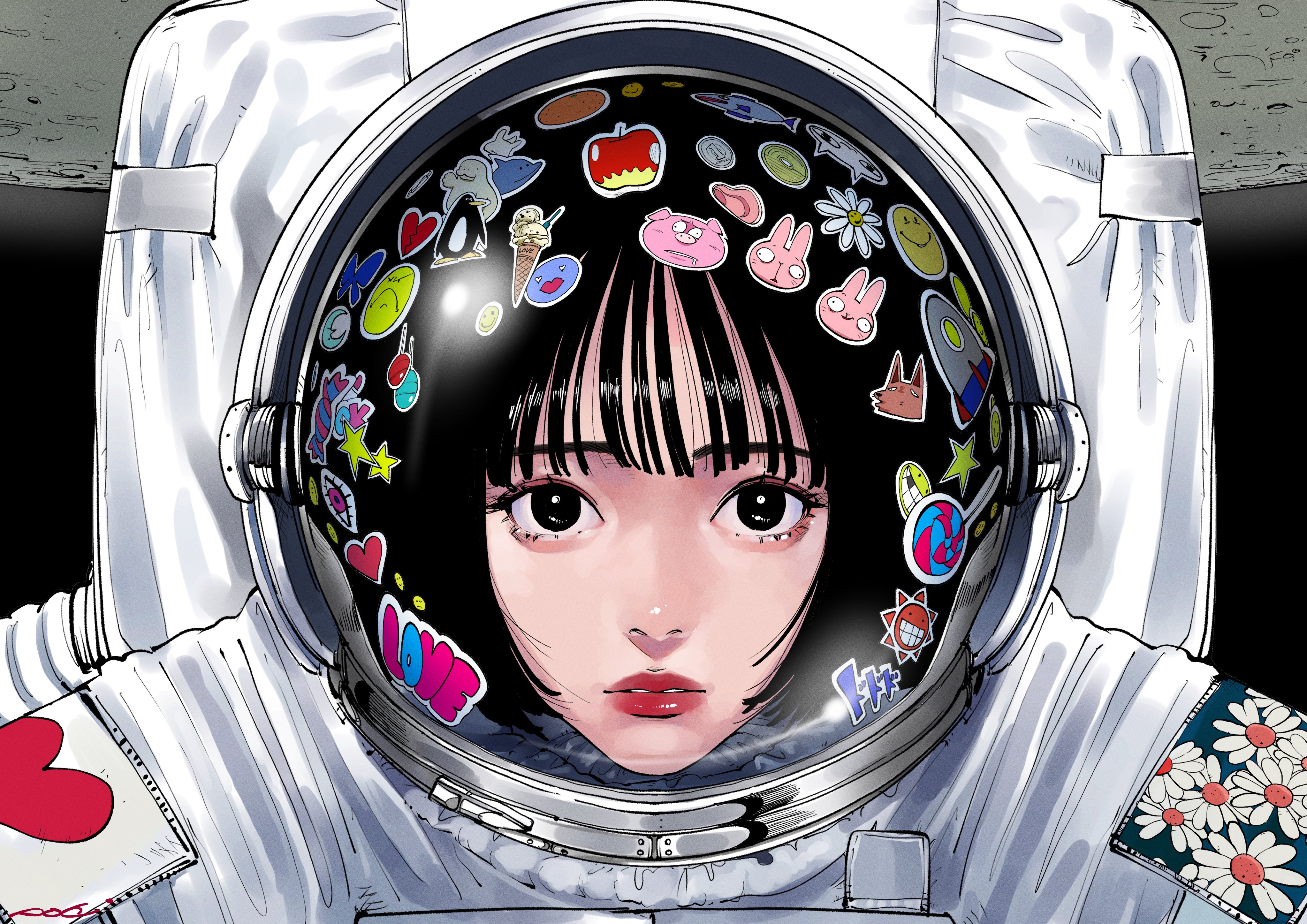 1girl absurdres apple astronaut bird black_eyes black_hair bug butterfly candy crater flower food fruit heart highres ice_cream_cone insect lollipop looking_at_viewer original parted_lips penguin pig poki_s25 portrait rabbit red_lips smiley_face solo space spacesuit star_(symbol) sticker white_flower