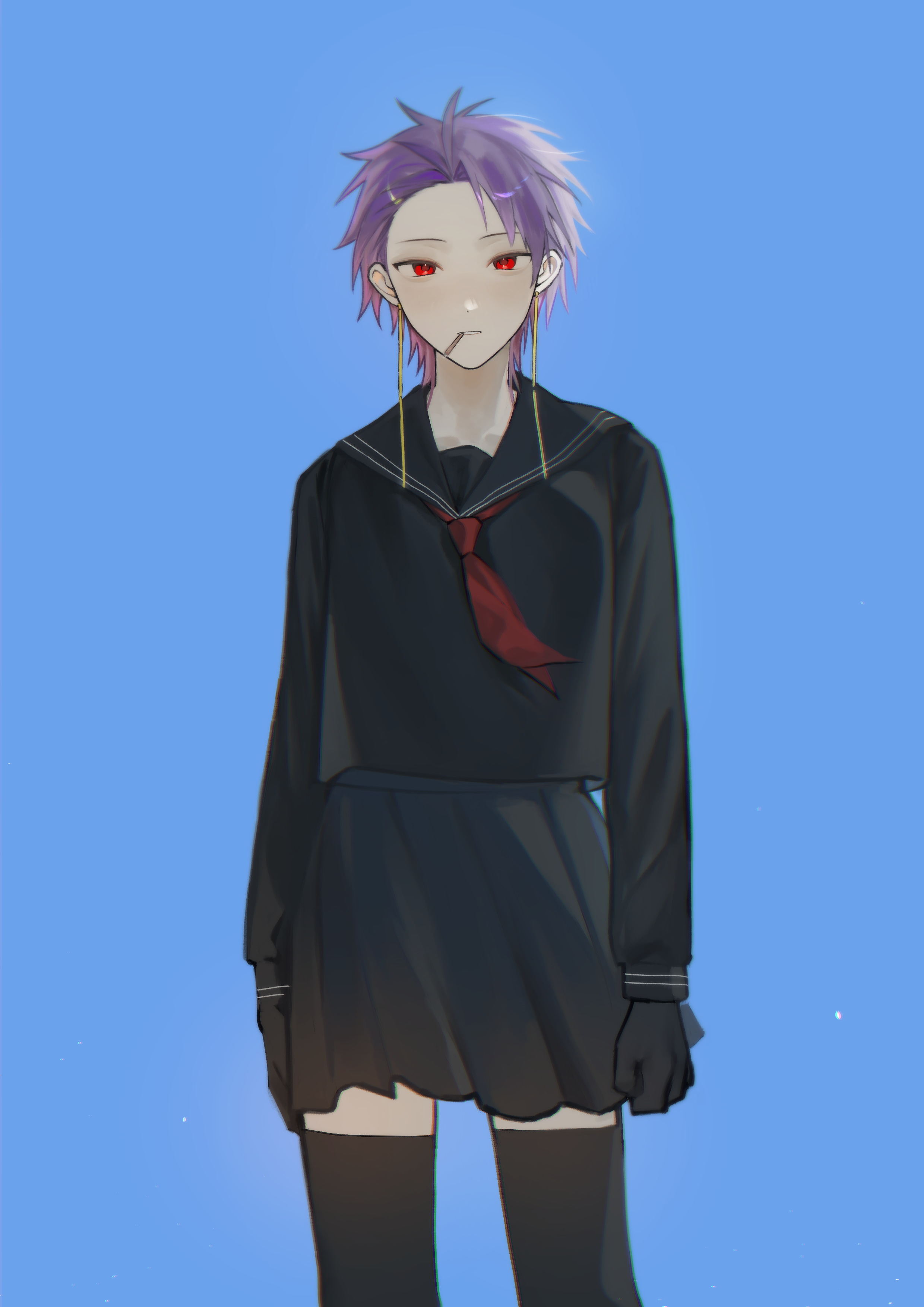 1boy absurdres arms_at_sides black_serafuku black_shirt black_skirt blue_background cigarette cowboy_shot crossdressing crossdressing_(mtf) earrings highres jewelry kyoko_(akakikyoko) long_sleeves male_focus miniskirt neckerchief pleated_skirt purple_hair red_eyes red_neckerchief saibou_shinkyoku sailor_collar sailor_shirt school_uniform serafuku shirt short_hair simple_background skirt solo theodore_riddle