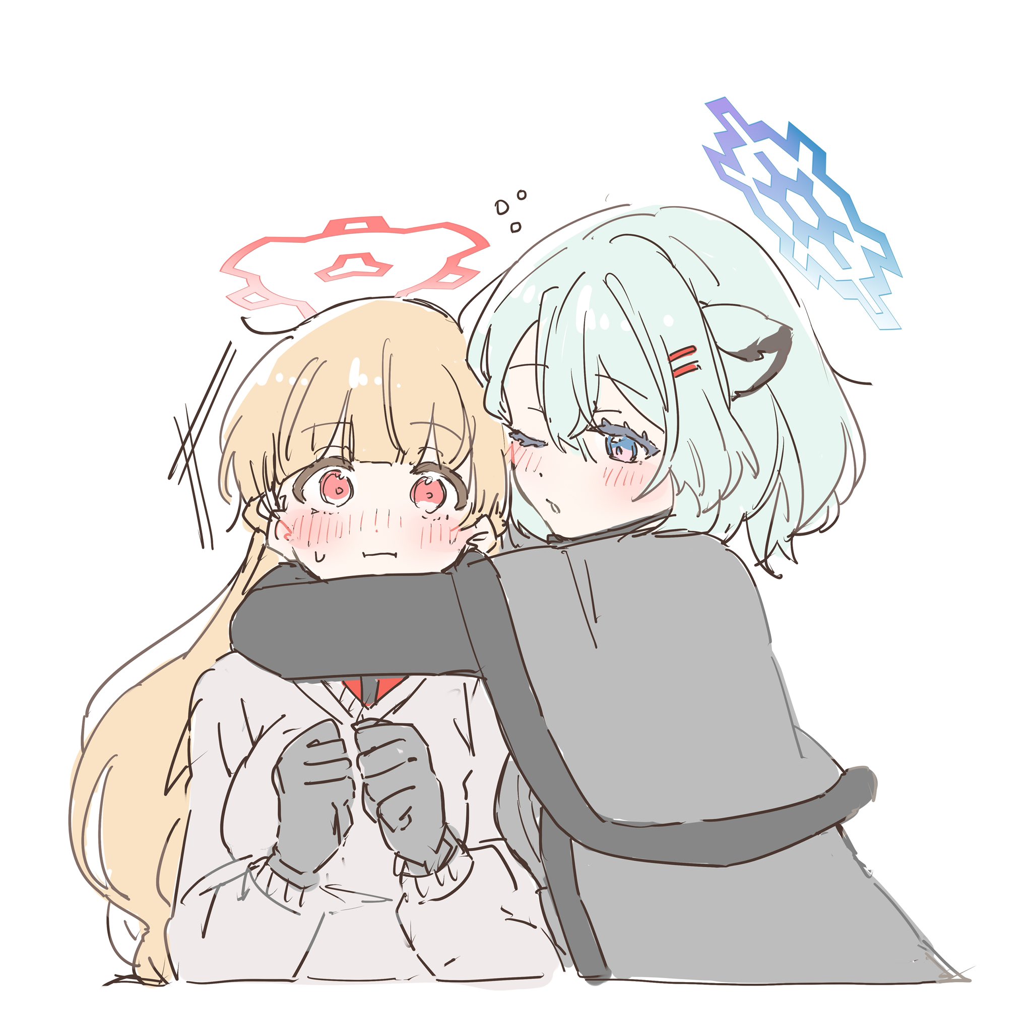 2girls animal_ears blonde_hair blue_archive blush breasts closed_mouth gloves grey_gloves hair_between_eyes hair_ornament hairclip halo highres hug long_hair long_sleeves medium_breasts multiple_girls nodoka_(blue_archive) one_eye_closed parted_lips red_eyes shigure_(blue_archive) simple_background sweat sweater unot_227 upper_body white_background