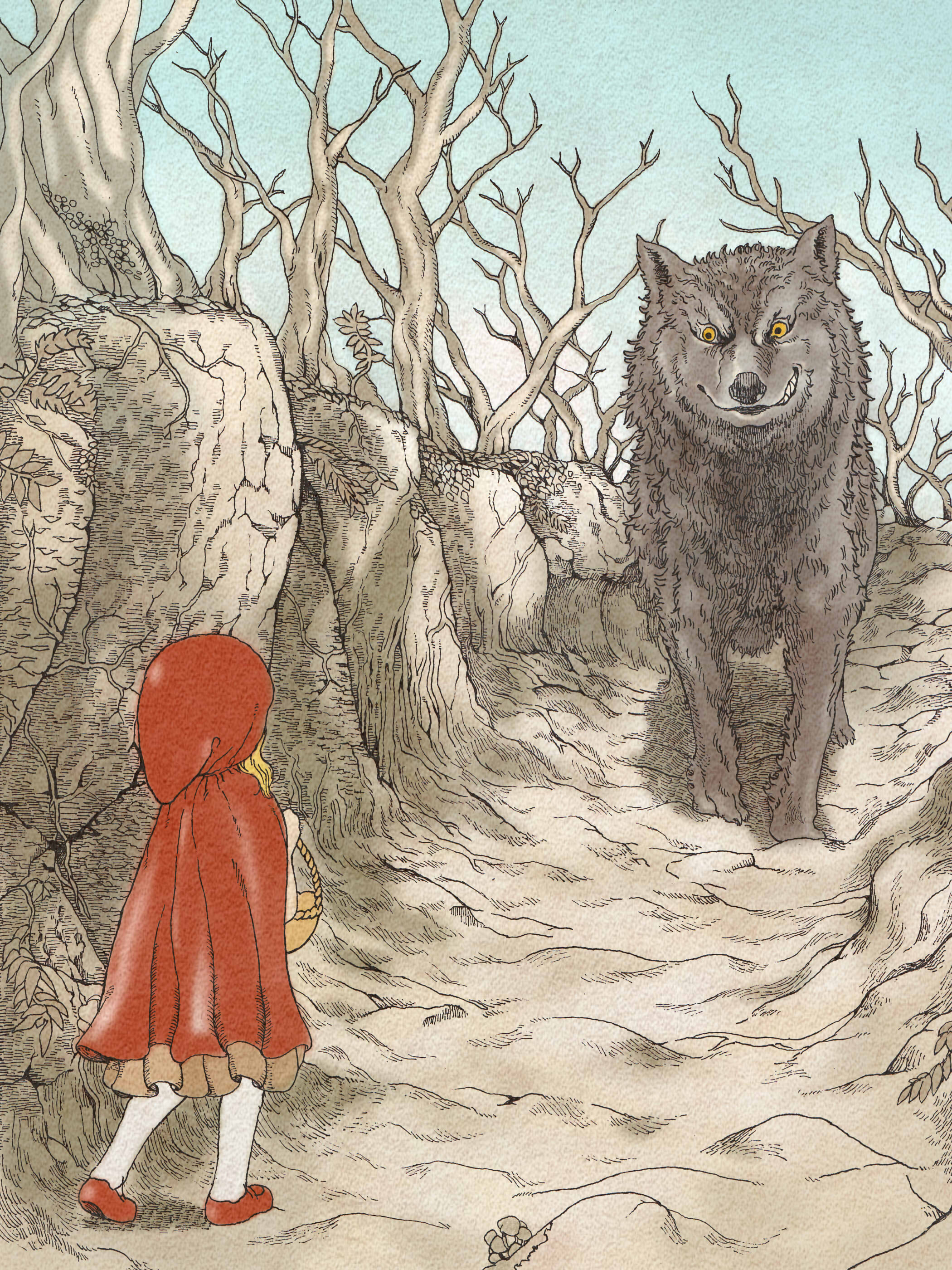 1girl absurdres animal autumn bare_tree basket big_bad_wolf blonde_hair brown_skirt cloak full_body highres holding holding_basket hood hood_up little_red_riding_hood_(fairy_tale) little_red_riding_hood_(fairy_tale_character) outdoors pantyhose path red_cloak red_footwear red_hood road semania9ja skirt tree white_pantyhose wolf yellow_eyes