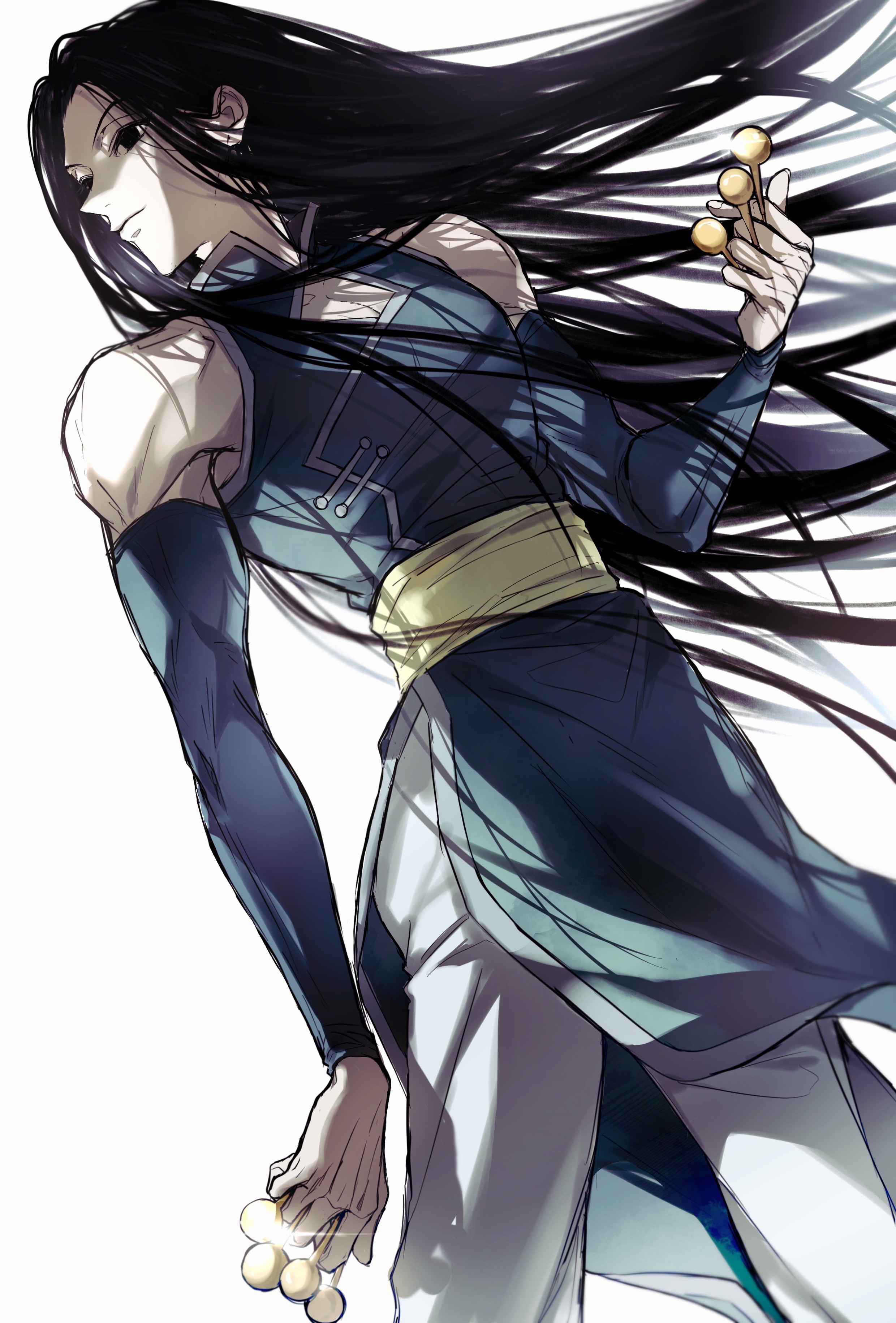 1boy absurdres bare_shoulders between_fingers black_eyes black_hair blue_dress blue_sleeves candy chinese_clothes chinese_commentary chupa_chups cleavage_cutout closed_mouth clothing_cutout commentary_request cowboy_shot detached_sleeves dress empty_eyes expressionless fanxxxwan floating_hair food high_collar highres holding holding_candy holding_food holding_lollipop hunter_x_hunter illumi_zoldyck lips lollipop long_hair long_sleeves looking_to_the_side pants pectoral_cleavage pectorals short_dress simple_background sleeveless sleeveless_dress solo straight_hair white_background white_pants