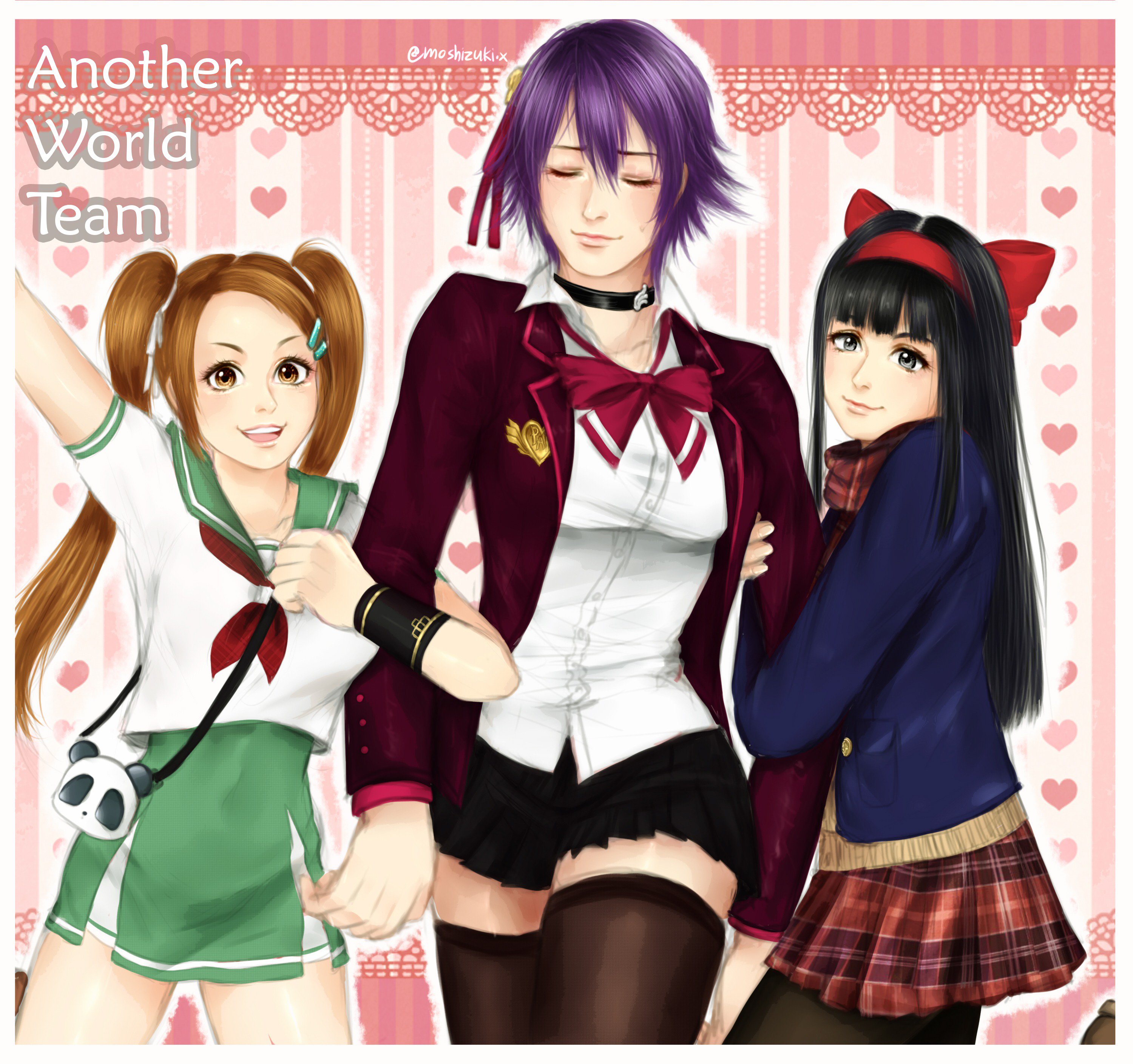 3girls absurdres alternate_costume alternate_hairstyle arm_grab arm_hug artist_name black_hair blush breasts brown_hair chair closed_eyes english_text grey_eyes hair_ribbon heart highres large_breasts legs long_hair looking_at_viewer love_heart_(kof) medium_breasts mui_mui_(snk) multiple_girls nakoruru official_alternate_costume pantyhose pink_lips purple_hair ribbon samurai_spirits school_uniform short_hair skirt smile snk the_king_of_fighters the_king_of_fighters_xiv thighs twintails