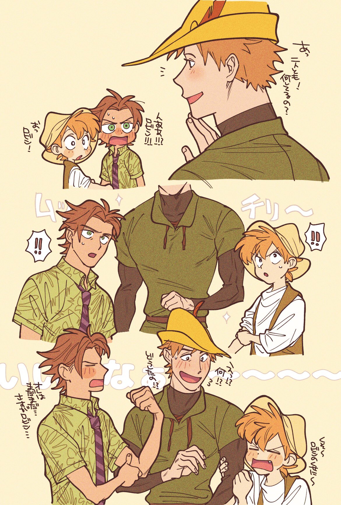 ! !! 3boys br'er_fox_(disney) brown_vest drawstring embarrassed fang fingernails green_eyes green_tunic hat hat_feather highres humanization long_sleeves male_focus multiple_boys muscle_envy necktie nick_wilde open_mouth orange_hair robin_hood_(disney_character) robin_hood_(disney_movie) shirt short_hair song_of_the_south striped_clothes striped_necktie toned toned_male translation_request tunic uochandayo vest waving white_shirt yellow_hat zootopia