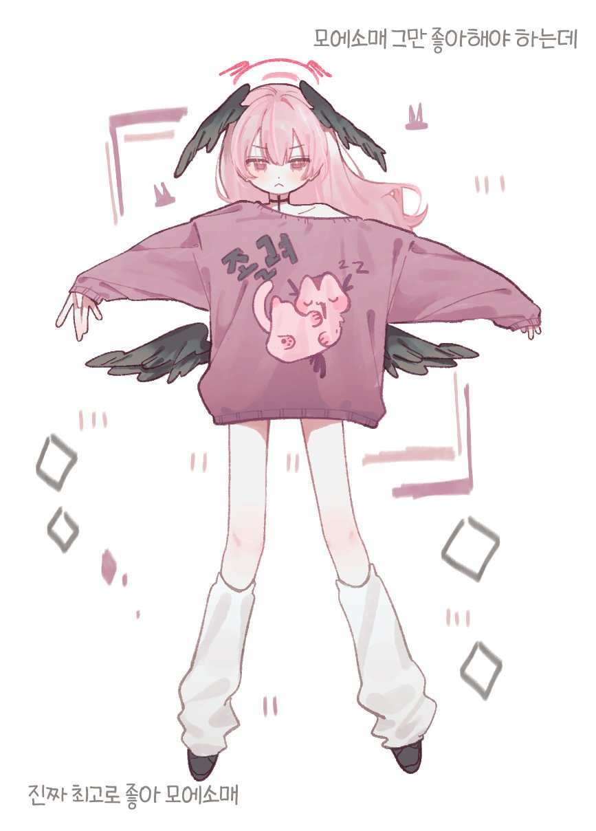 1girl :< alternate_costume black_shoes black_wings blue_archive blush closed_mouth clothes_writing full_body halo head_wings highres koharu_(blue_archive) korean_text long_hair long_sleeves loose_socks nagakiras2 outstretched_arms pink_eyes pink_hair pink_sweater red_halo shoes simple_background sleeves_past_wrists socks solo spread_arms sweater white_background white_socks wings