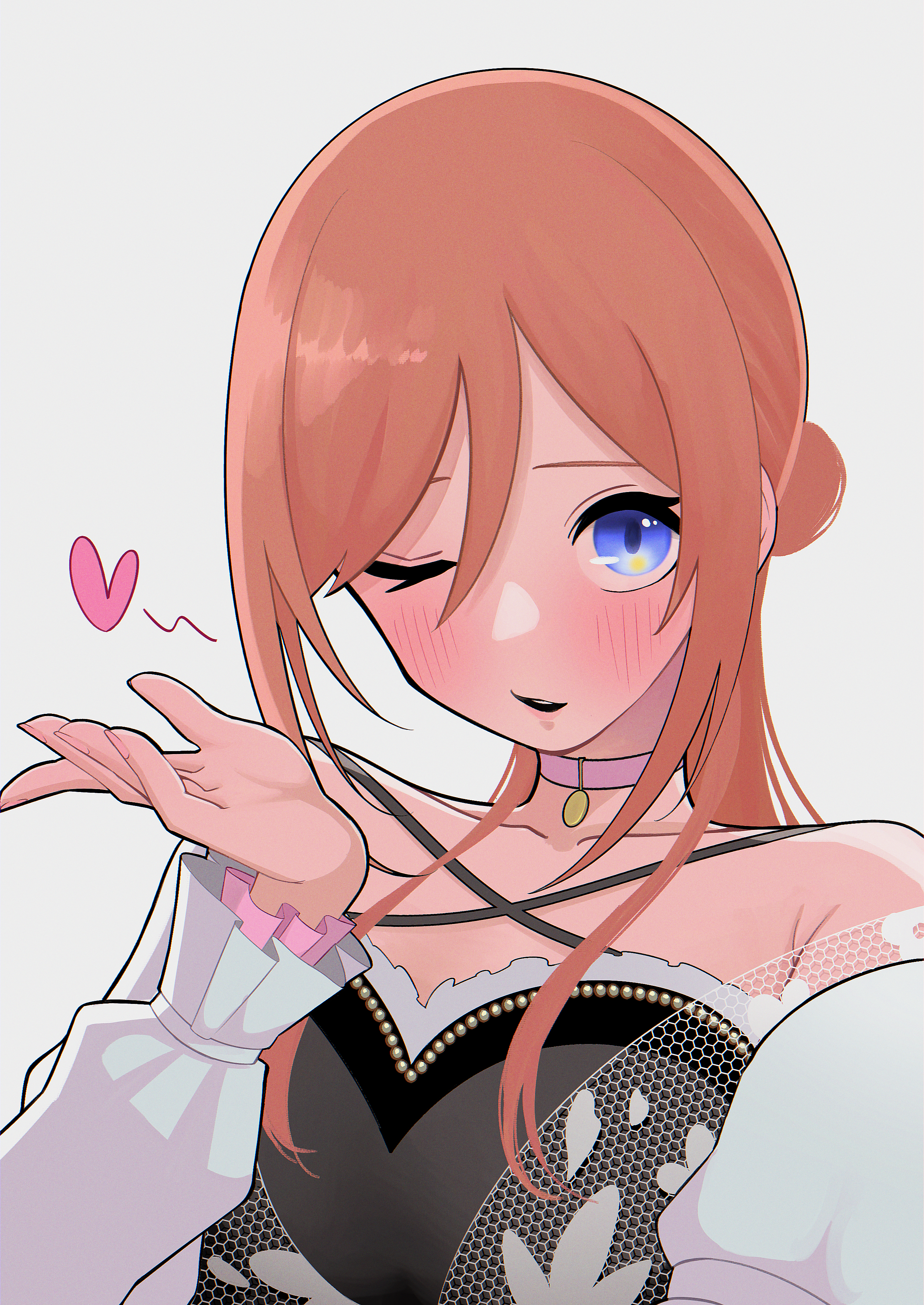 1girl ;o absurdres armpit_crease bare_shoulders blowing_kiss blue_eyes brown_hair choker collarbone gakuen_idolmaster hair_bun heart highres himesaki_rinami idolmaster long_hair long_sleeves looking_at_viewer one_eye_closed pink_choker simple_background single_side_bun solo tk_nomanomayei upper_body white_background