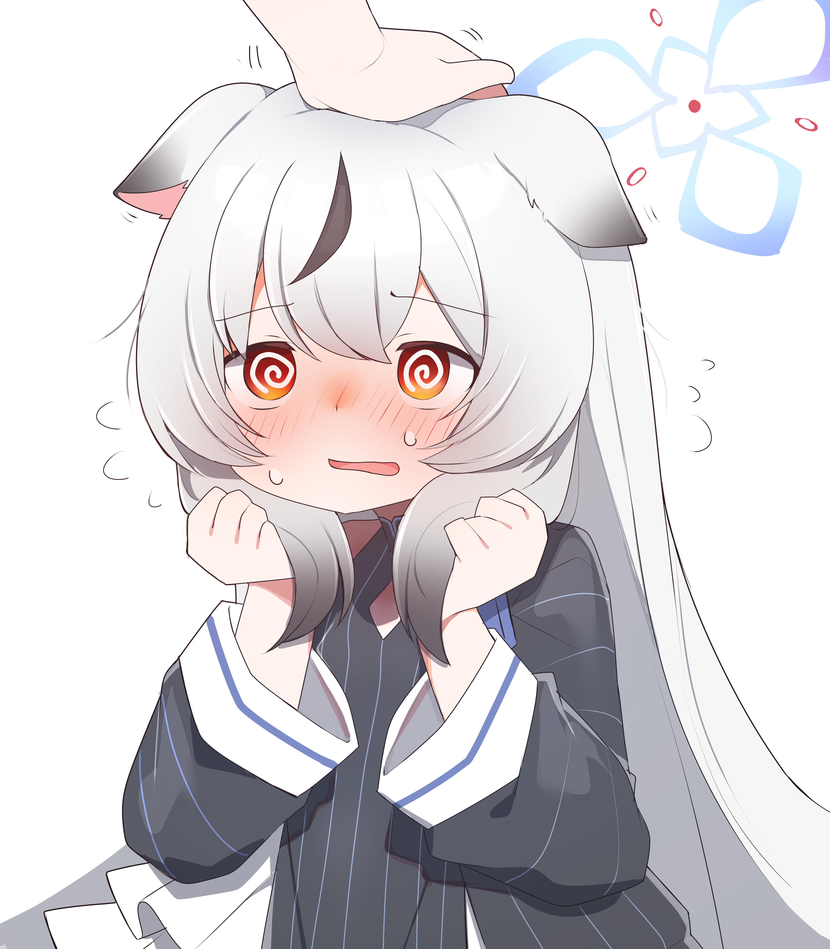 1girl 1other @_@ absurdres animal_ears black_hair black_jacket blue_archive blue_halo blush breast_cutouts colored_tips commentary_request crossed_bangs dress flat_chest frilled_dress frills full-face_blush gradient_halo hair_between_eyes halo hands_up headpat highres holding holding_own_hair jacket kokona_(blue_archive) long_hair looking_to_the_side multicolored_hair multicolored_halo open_mouth red_eyes red_halo single_off_shoulder sleeveless sleeveless_dress sousakuganba_ru streaked_hair striped_clothes sweat two-tone_hair vertical-striped_clothes very_long_hair white_background white_hair wide_sleeves