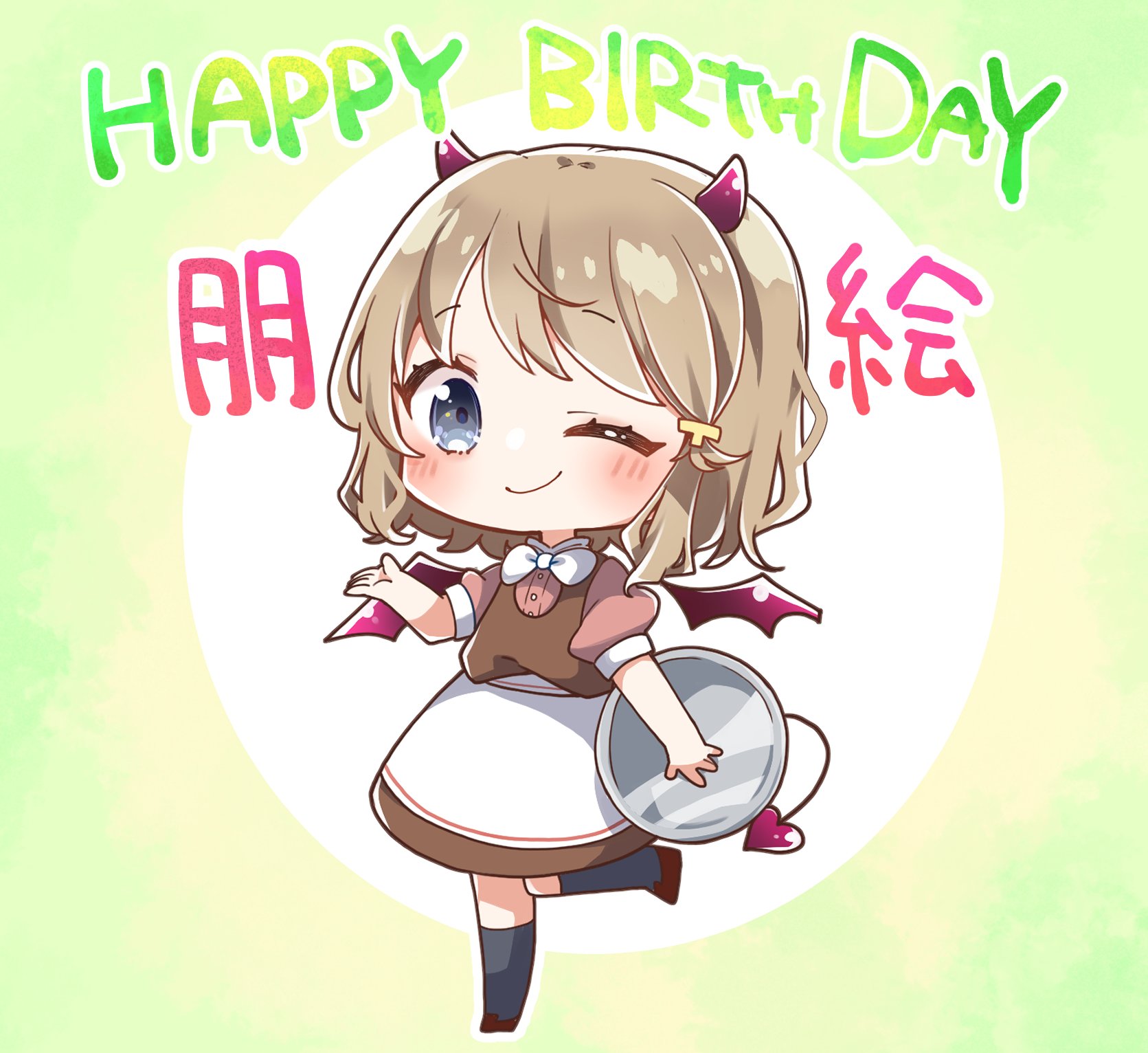1girl ;) black_shoes black_socks blush bow bowtie brown_dress brown_hair brown_shirt chibi commentary_request demon_girl demon_horns demon_tail demon_wings detached_wings dress full_body green_background grey_eyes hair_ornament happy_birthday highres holding holding_tray horns jako_(jakoo21) kneehighs koga_tomoe looking_at_viewer one_eye_closed puffy_short_sleeves puffy_sleeves purple_wings seishun_buta_yarou shirt shoes short_sleeves sleeveless sleeveless_dress smile socks solo standing standing_on_one_leg tail translation_request tray two-tone_background white_background white_bow white_bowtie wings