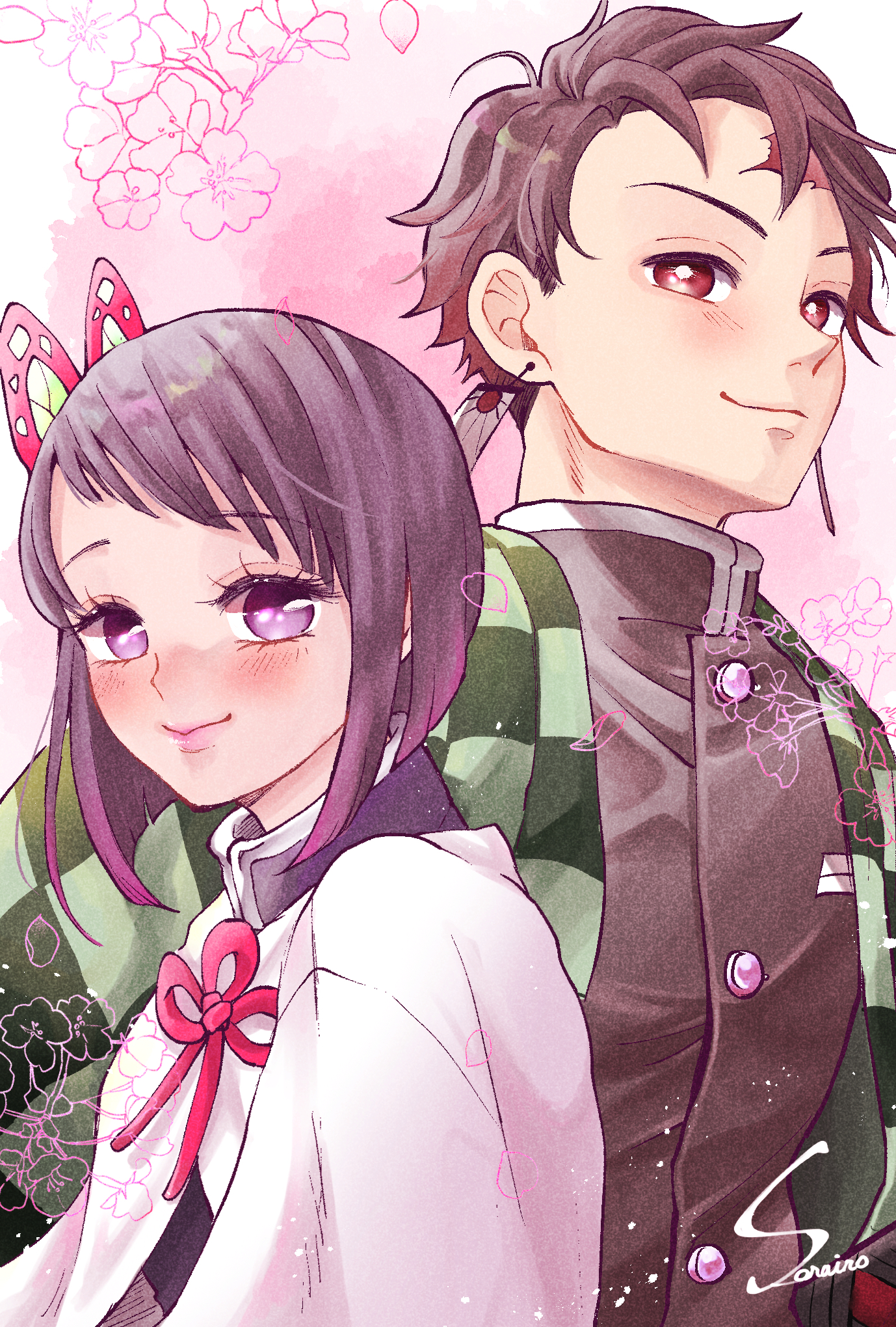 1boy 1girl alternate_hair_length alternate_hairstyle bob_cut branch brown_hair checkered_clothes cherry_blossoms cloak closed_mouth demon_slayer_uniform earrings hanafuda_earrings haori height_difference hetero highres inverted_bob japanese_clothes jewelry kamado_tanjirou kimetsu_no_yaiba light_particles long_sleeves looking_at_viewer looking_to_the_side petals pink_background pink_lips purple_eyes red_eyes scar scar_on_face scar_on_forehead short_hair signature sky_blue_025250 swept_bangs tsuyuri_kanao upper_body white_background white_cloak