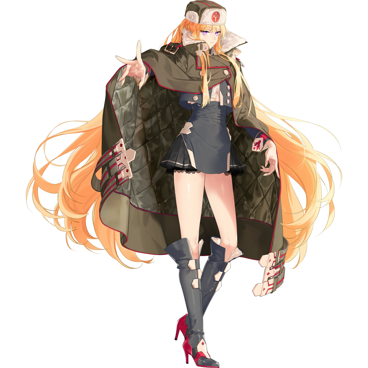1girl artist_request black_boots black_coat blonde_hair boots brown_coat brown_collar brown_hat buttons closed_mouth coat collar collared_coat double-breasted final_gear frown full_body fur_hat hat high_heel_boots high_heels highres horizontal-striped_belt horizontal-striped_skirt long_hair long_sidelocks looking_at_viewer midriff_peek natasha_(final_gear) official_art outstretched_arm pleated_skirt puffy-trimmed_coat puffy-trimmed_collar purple_eyes sidelocks simple_background single_horizontal_stripe skirt solo standing standing_on_one_leg tachi-e third-party_source transparent_background two-tone_belt ushanka very_long_hair