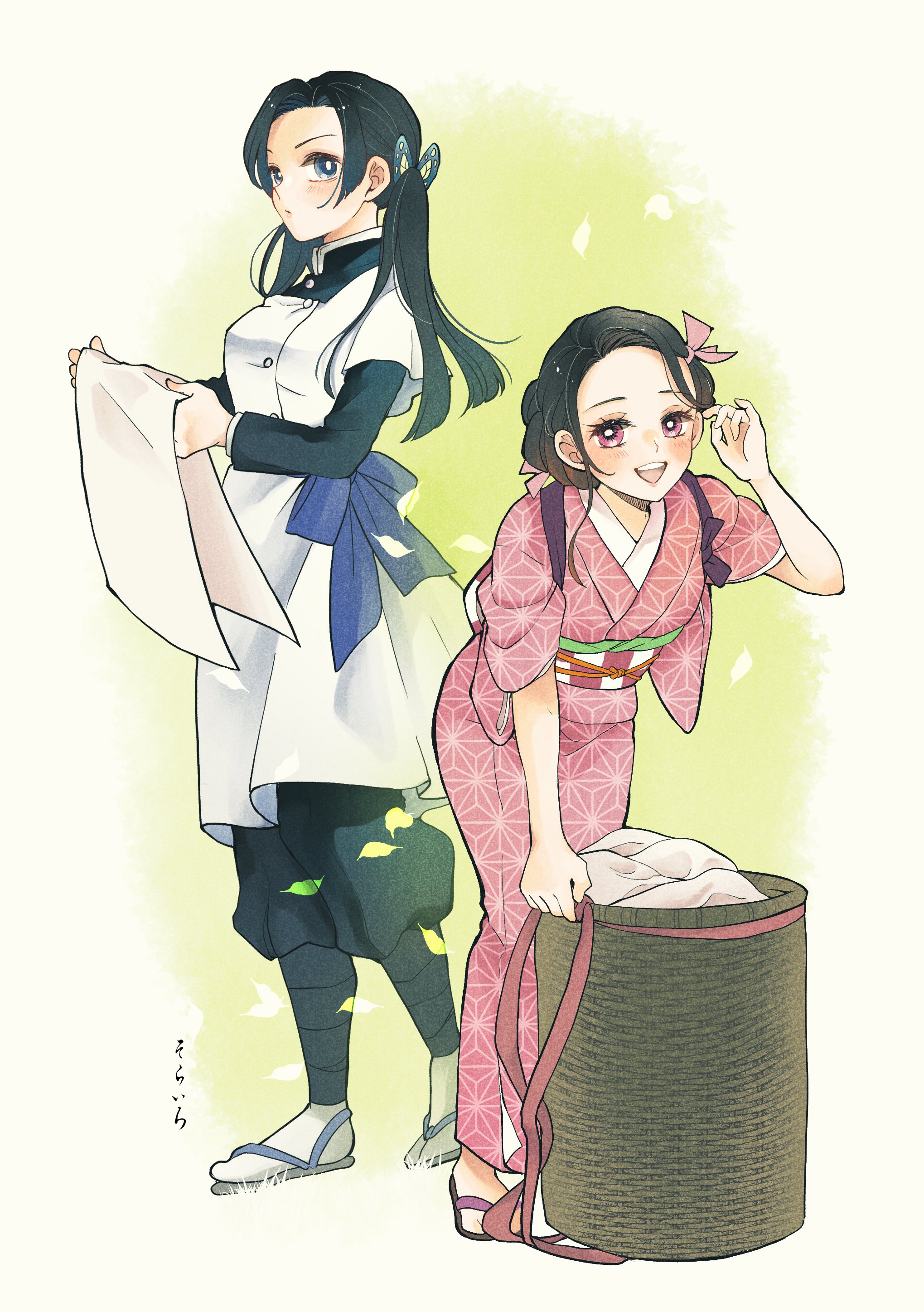2girls absurdres adjusting_hair aged_up alternate_hair_length alternate_hairstyle asa_no_ha_(pattern) basket black_hair black_pants blanket blue_eyes breasts butterfly_hair_ornament demon_slayer_uniform dress falling_leaves full_body hair_ornament hair_over_shoulder hair_ribbon highres holding holding_blanket japanese_clothes kamado_nezuko kanzaki_aoi_(kimetsu_no_yaiba) kimetsu_no_yaiba kimono laundry leaf leaning_forward long_hair long_sleeves looking_at_viewer medium_breasts multiple_girls obi pants parted_bangs pink_eyes pink_kimono pink_ribbon ribbon sandals sash sideways_glance sky_blue_025250 small_breasts smile socks standing tabi tasuki twintails updo waraji white_dress white_socks wind yellow_background zouri