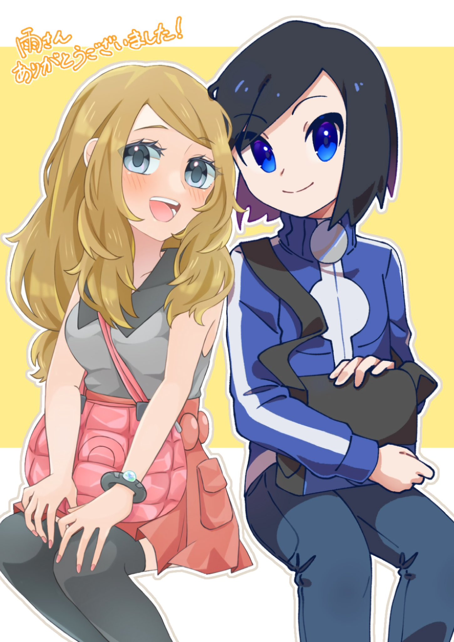 1boy 1girl :d artist_collaboration bag black_hair black_thighhighs blonde_hair blue_eyes blue_jacket blue_pants bracelet breasts calem_(pokemon) closed_mouth collared_shirt fingernails grey_eyes grey_shirt handbag high-waist_skirt highres jacket jewelry long_hair low-tied_long_hair medium_breasts mega_stone miniskirt nail_polish nintendo omochi_(omotimotittona3) open_mouth pants pink_bag pink_nails pleated_skirt pokemon pokemon_x_and_y rain_(tonight_862) red_skirt serena_(pokemon) shirt sitting skirt smile split_mouth teeth thighhighs turtleneck turtleneck_jacket zettai_ryouiki