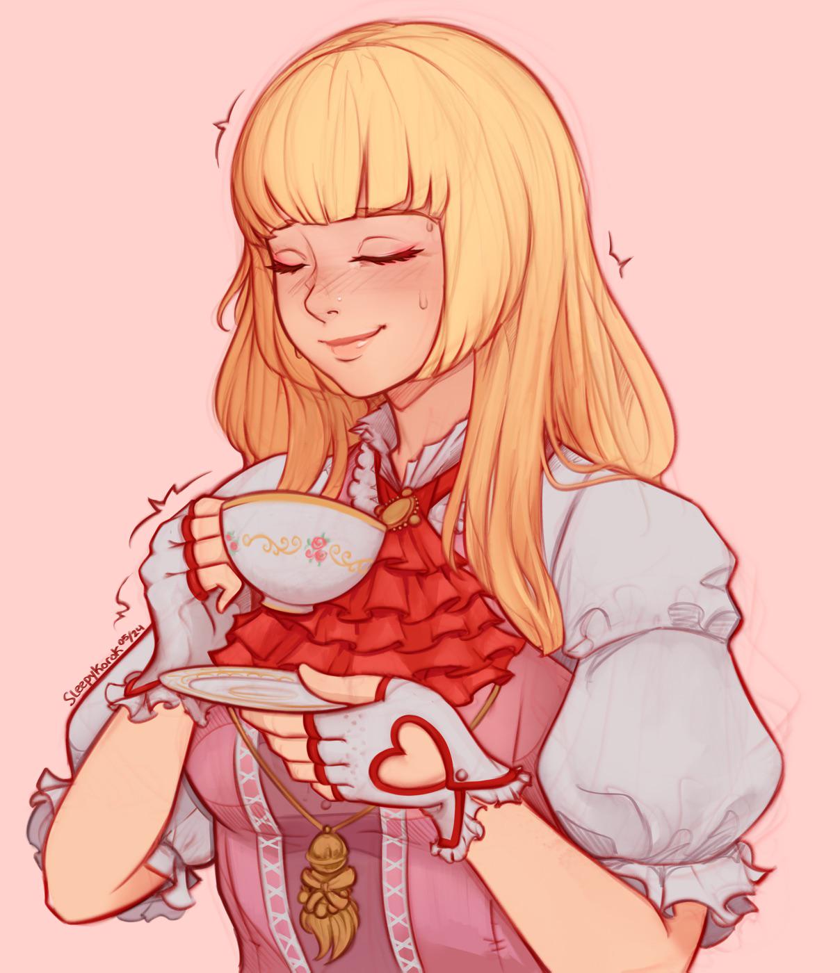 1girl artist_name blonde_hair closed_eyes commentary cup dress emilie_de_rochefort english_commentary fingerless_gloves gloves highres holding holding_saucer long_hair pink_dress puffy_short_sleeves puffy_sleeves saucer short_sleeves simple_background sleepy_korok solo teacup tekken upper_body white_gloves