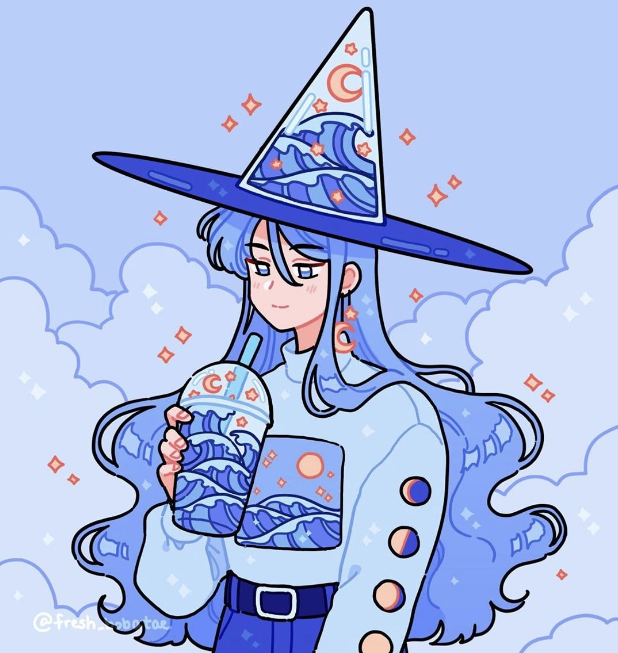1girl anime_coloring bad_id bad_instagram_id belt belt_buckle blue_background blue_belt blue_eyes blue_hair blue_hat blue_pants blue_shirt blue_theme buckle closed_mouth cloud cowboy_shot crescent crescent_moon cup denim disposable_cup drink drinking_straw earrings emily_kim floating_earrings hat highres holding holding_drink instagram_username jeans jewelry long_hair long_sleeves moon moon_phases moon_print original pants puffy_long_sleeves puffy_sleeves see-through_clothes see-through_headwear shirt simple_background smile solo sparkle star_(symbol) star_earrings turtleneck turtleneck_shirt very_long_hair wave_print waves wavy_hair witch witch_hat