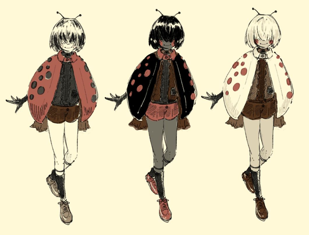 1boy antennae arthropod_boy black_hair black_socks cape drawfag dress_shirt full_body hair_over_eyes legwear_garter limited_palette male_focus original red_footwear shirt shoes short_hair shorts simple_background smile socks variations white_hair
