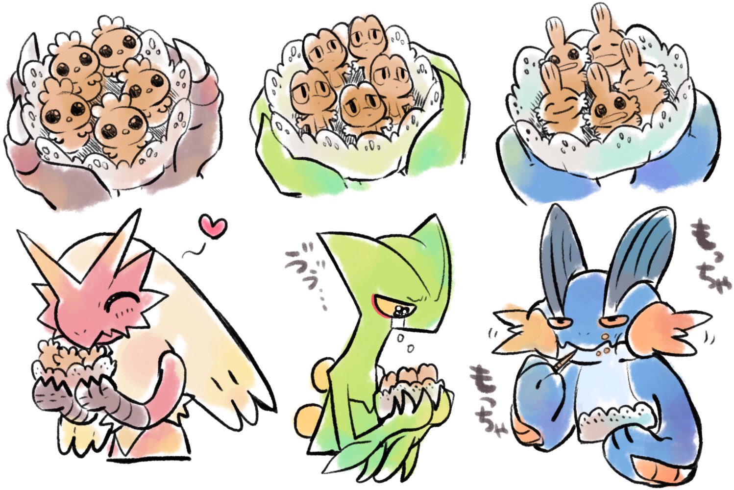 ajinomisni black_eyes blaziken blonde_hair claws closed_mouth colored_sclera crying eating food gen_3_pokemon heart mudkip nintendo orange_sclera pokemon pokemon_(creature) sad sceptile smile swampert tears torchic treecko white_background yellow_sclera