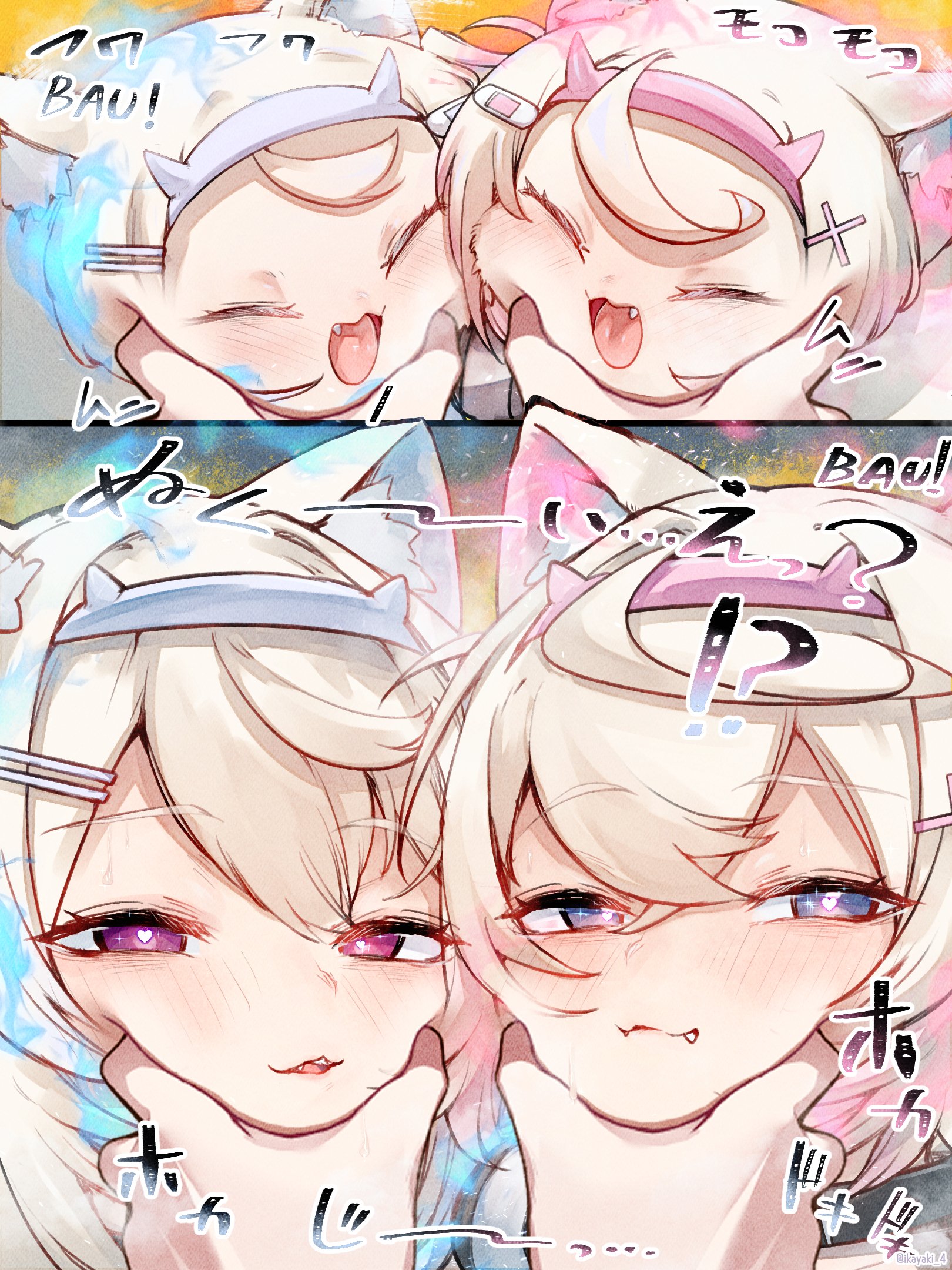 1other 2girls :3 :d animal_ears blonde_hair blue_hair blue_hairband blush closed_eyes commentary_request dog dog_ears dog_girl fang fuwawa_abyssgard fuwawa_abyssgard_(1st_costume) fuwawa_abyssgard_(dog) hairband heart heart-shaped_pupils highres hololive hololive_english ikayaki_(ikayaki4) long_hair looking_at_viewer meme mococo_abyssgard mococo_abyssgard_(1st_costume) mococo_abyssgard_(dog) multiple_girls open_mouth parted_lips pink_hair pink_hairband pov pov_cheek_grabbing_(meme) short_hair siblings sisters smile sound_effects symbol-shaped_pupils twins upper_body virtual_youtuber