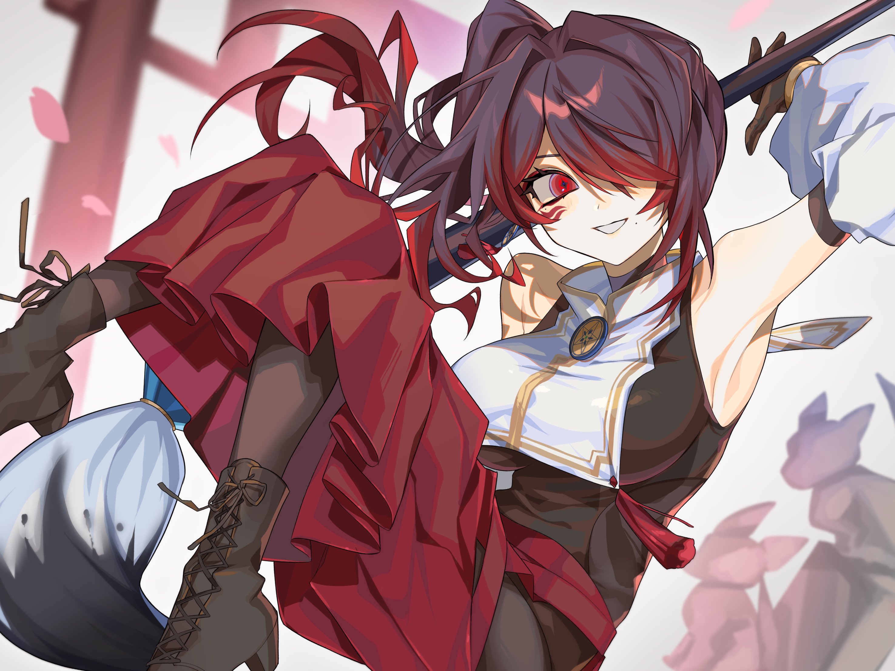 1girl arm_up arm_warmers armpits black_footwear black_gloves black_pantyhose black_shirt blurry blurry_background boots commission cross-laced_footwear from_below giant_brush gloves gradient_hair grin hair_intakes hair_over_one_eye hamita_(rikopin_ika) highres holding holding_paintbrush knees_up long_hair mole mole_under_eye mole_under_mouth multicolored_hair multicolored_shirt open_mouth original oversized_object paintbrush pantyhose petals pink_petals red_eyes red_skirt ringed_eyes shirt shoelaces side_ponytail skirt sleeveless smile tassel torii white_arm_warmers white_shirt yellow_trim