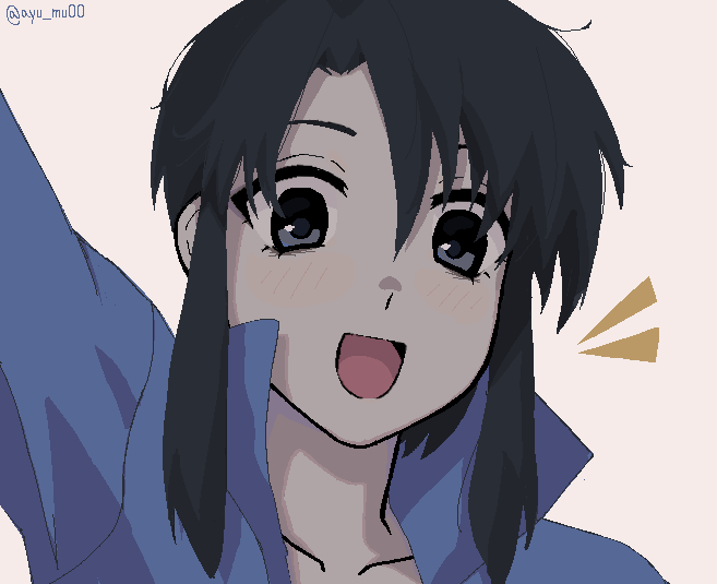1girl arm_up ayu_mu00 azumanga_daiou black_hair blue_shirt blush_stickers collared_shirt commentary grey_background grey_eyes hair_between_eyes kurosawa_minamo looking_at_viewer microsoft_paint_(medium) open_mouth portrait shirt sidelocks simple_background smile solo twitter_username