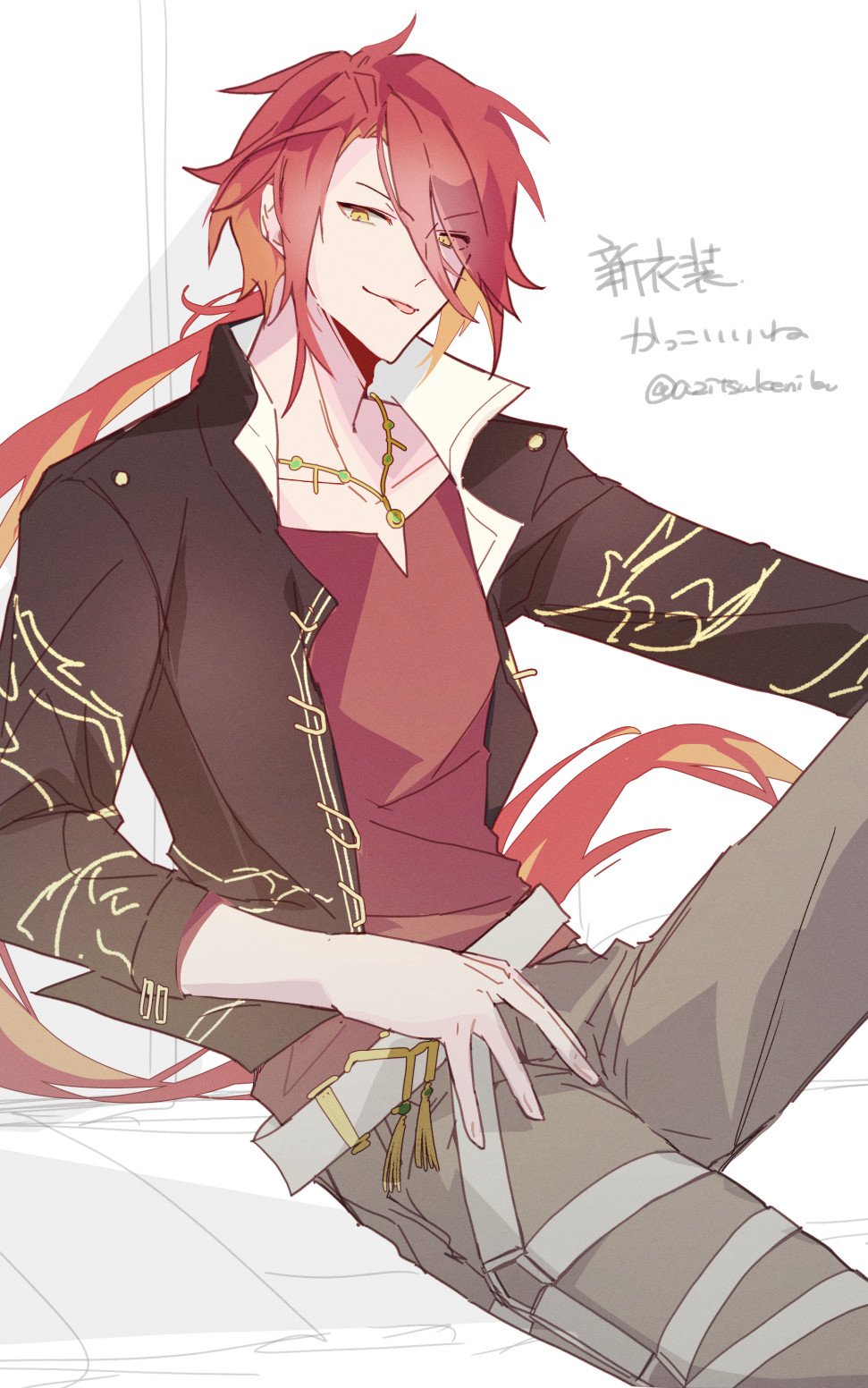 1boy :p aaron_wei azitsukeniku belt black_jacket collarbone eiyuu_densetsu grey_pants hair_between_eyes highres jacket jewelry kai_no_kiseki kuro_no_kiseki_(series) kuro_no_kiseki_i long_hair low_ponytail male_focus necklace open_clothes open_jacket pants ponytail red_hair red_shirt shirt sitting solo tongue tongue_out translation_request white_background yellow_eyes