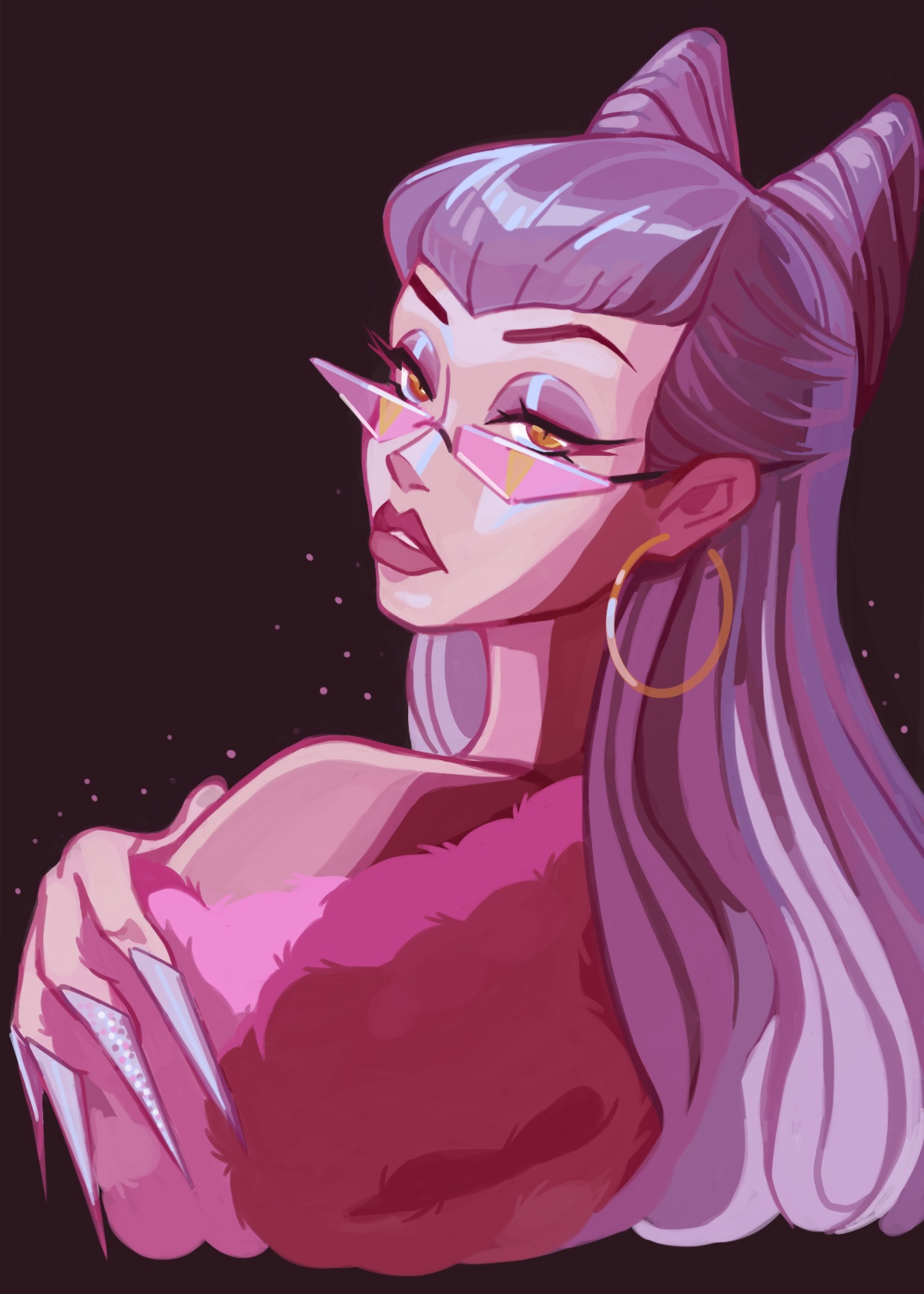 1girl claw_(weapon) coat cone_hair_bun dark_background demon demon_girl earrings evelynn_(league_of_legends) eyeshadow fur-trimmed_coat fur_trim gold_earrings hair_bun highres hoop_earrings jewelry league_of_legends long_hair looking_at_viewer makeup parted_lips pink_coat pink_lips purple-tinted_eyewear purple_eyeshadow slit_pupils solo the_baddest_evelynn tinted_eyewear weapon yellow_eyes