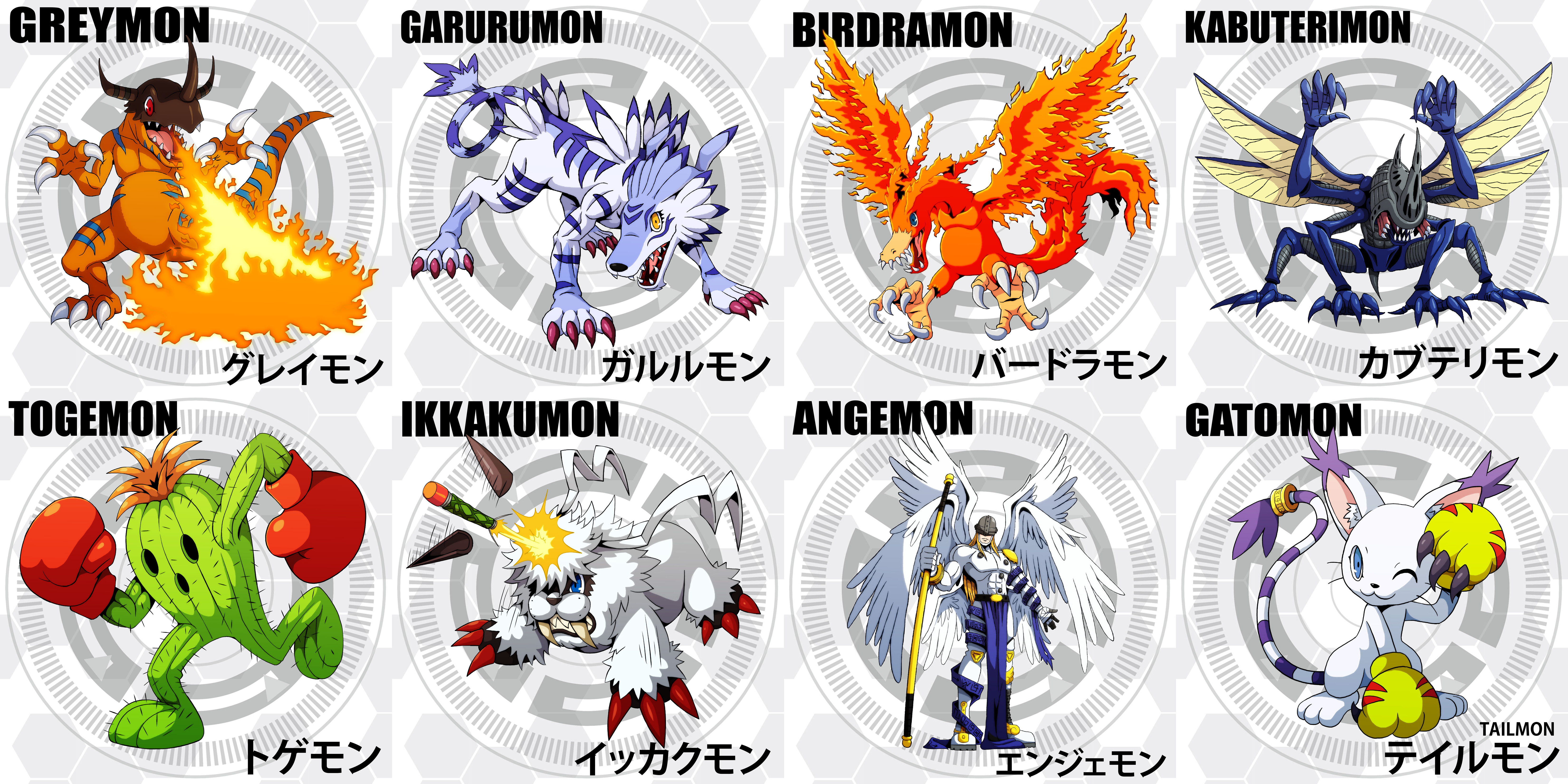 absurdres angel angel_boy angemon birdramon cat digimon digimon_(creature) garurumon gloves greymon highres ikkakumon kabuterimon tailmon togemon wings