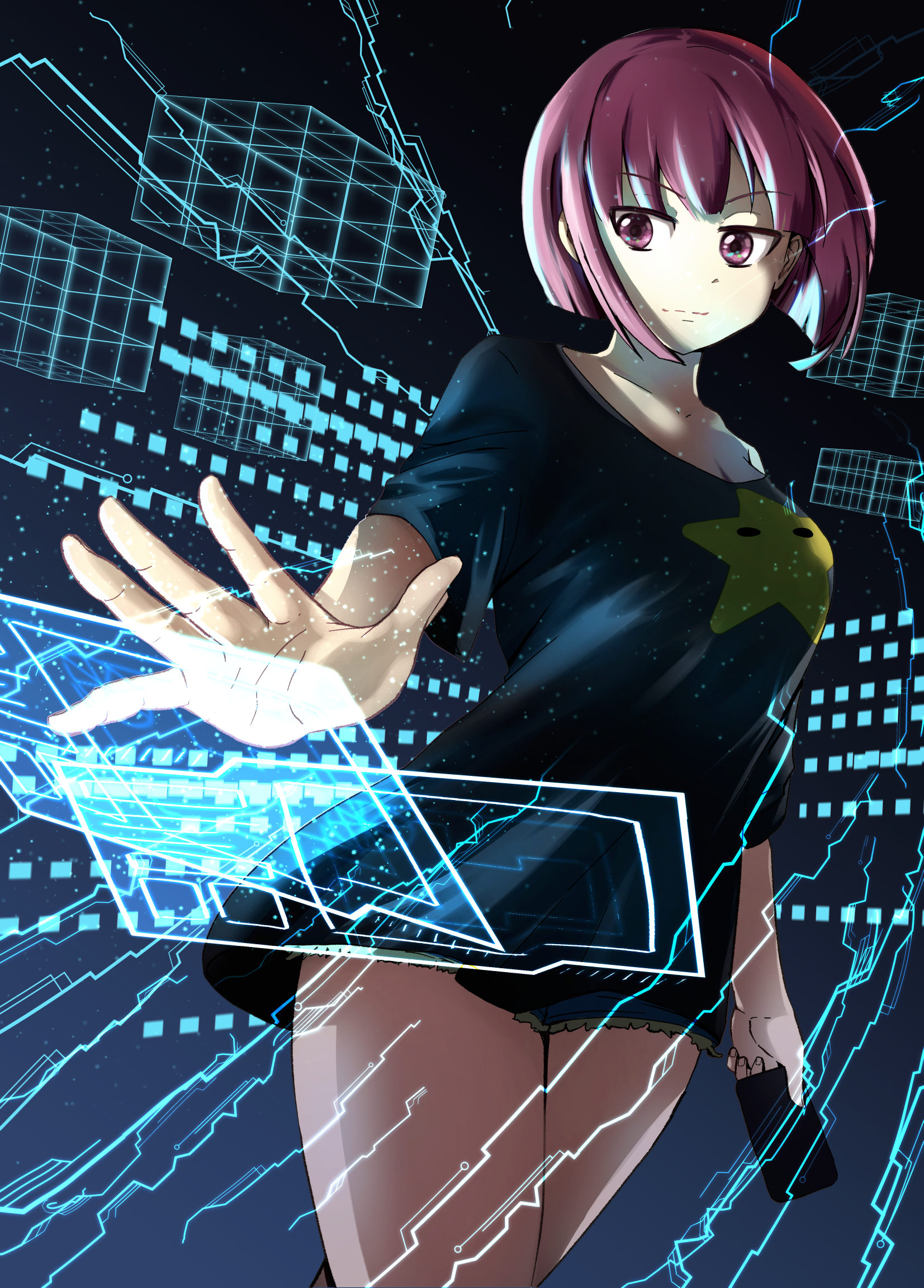 1girl bare_legs breasts electricity highres holding holding_phone holographic_interface light_smile loose_clothes loose_shirt neck phone purple_eyes purple_hair ryougen_(koh_y1) shirt short_hair short_sleeves shorts solo star_(symbol) star_print yozakura-san_chi_no_daisakusen yozakura_shion