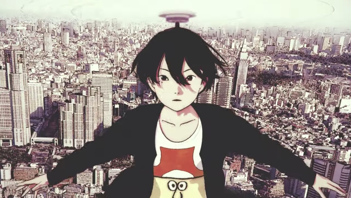1boy :o black_eyes black_hair black_jacket city dead_dead_demons_de_dedede_destruction jacket long_hair looking_at_viewer male_focus ooba_keita open_mouth shirt solo surprised white_shirt