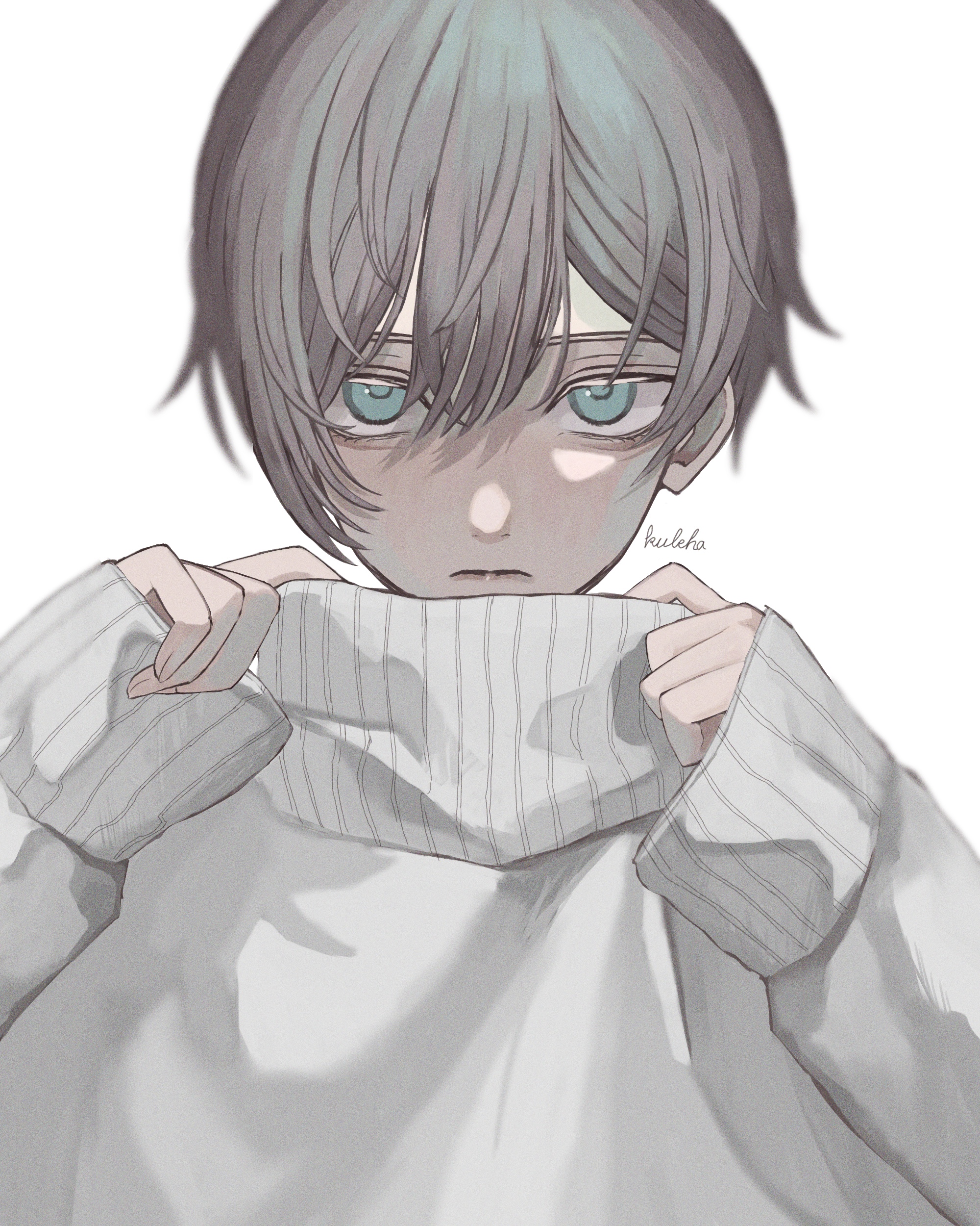 1boy absurdres blue_eyes commentary_request highres kuleha_s looking_at_viewer male_focus original short_hair signature simple_background solo sweater white_background