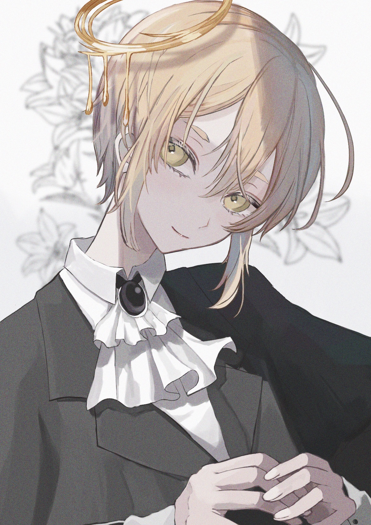 1boy androgynous black_gem blonde_hair collared_shirt commission gem halo head_tilt highres kuleha_s original pixiv_commission shirt short_hair tagme yellow_eyes
